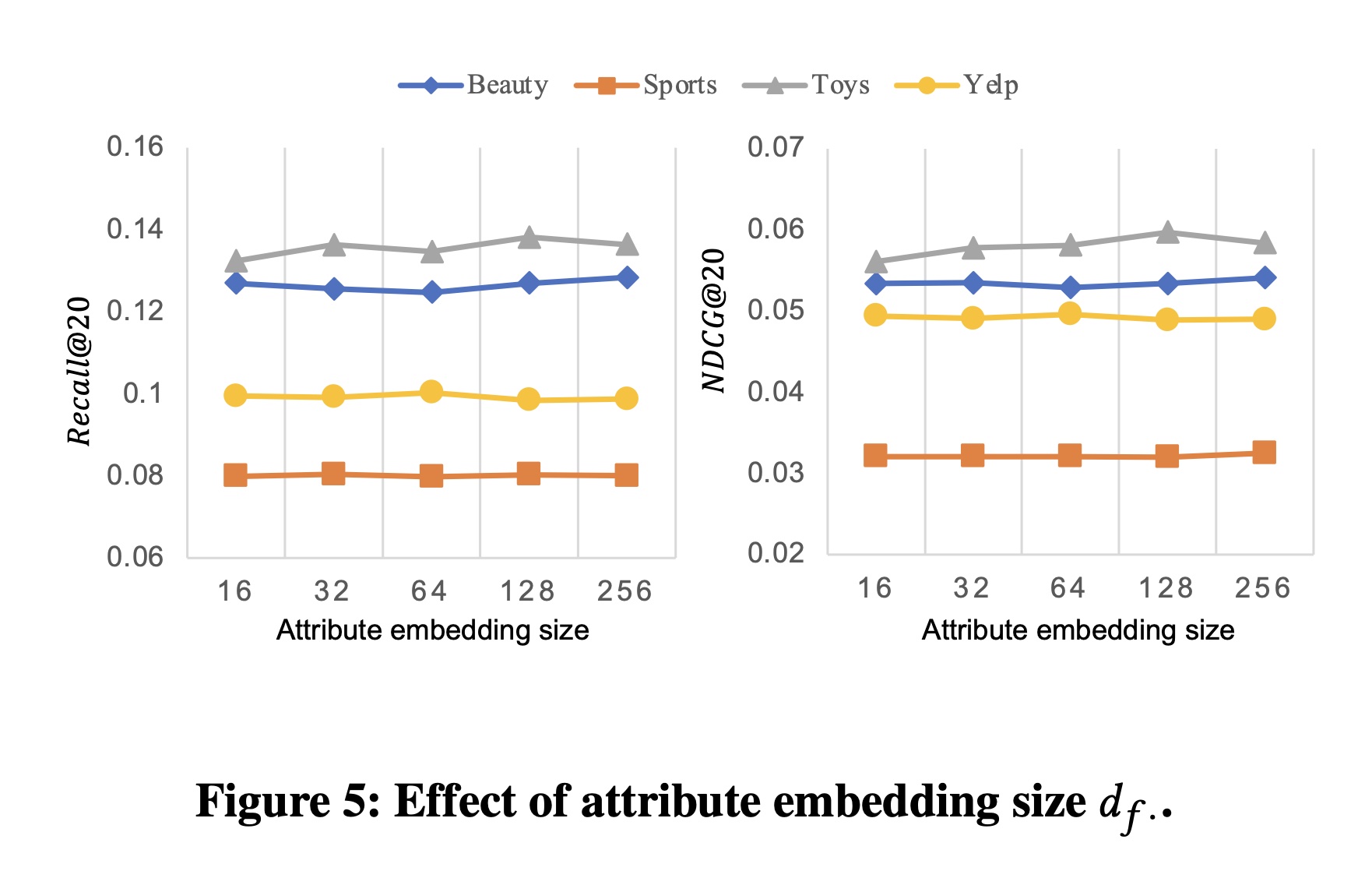Figure 5 展示了 attribute embedding size 对 DIF-SR 性能的影响。我们观察到,在大多数情况下,不同的 attribute embedding size item embedding 的维度),大幅降低 DIF-SR 的模型复杂度。