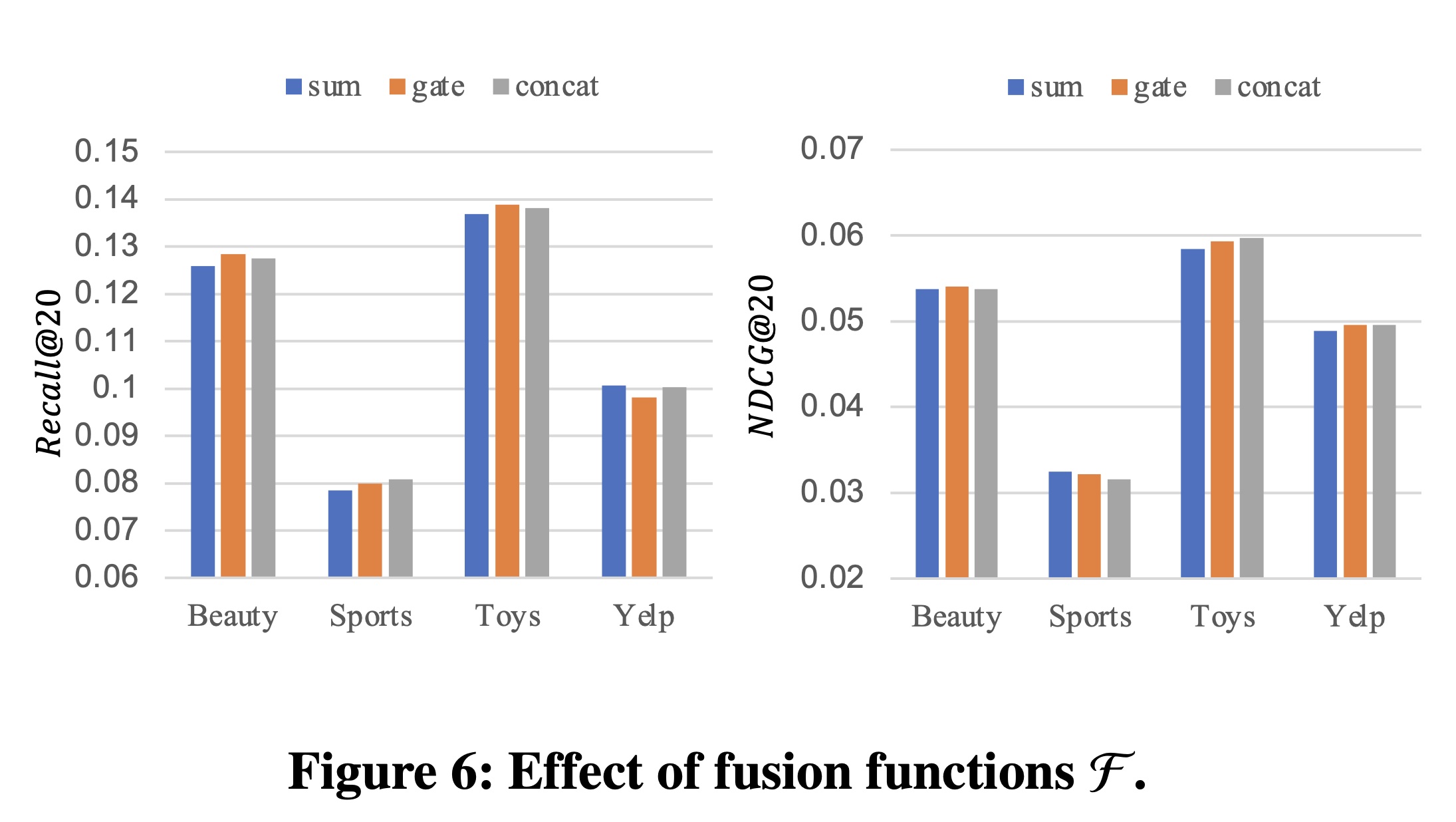 Figure 6 表明我们的方法对于不同的融合函数也具有稳健性,这表明简单的融合解决方案(如加法融合)不会损害我们模型的能力。