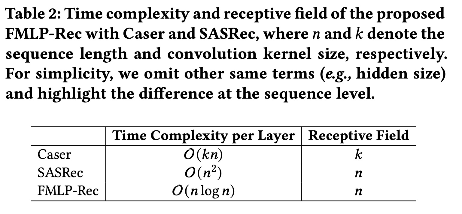 首先,Caser 在时域中执行卷积操作,因此其时间复杂度和感受野分别为 Caser 依赖卷积核来捕获序列模式,通常需要更大的核大小来扩展感受野以获得更好的性能。
