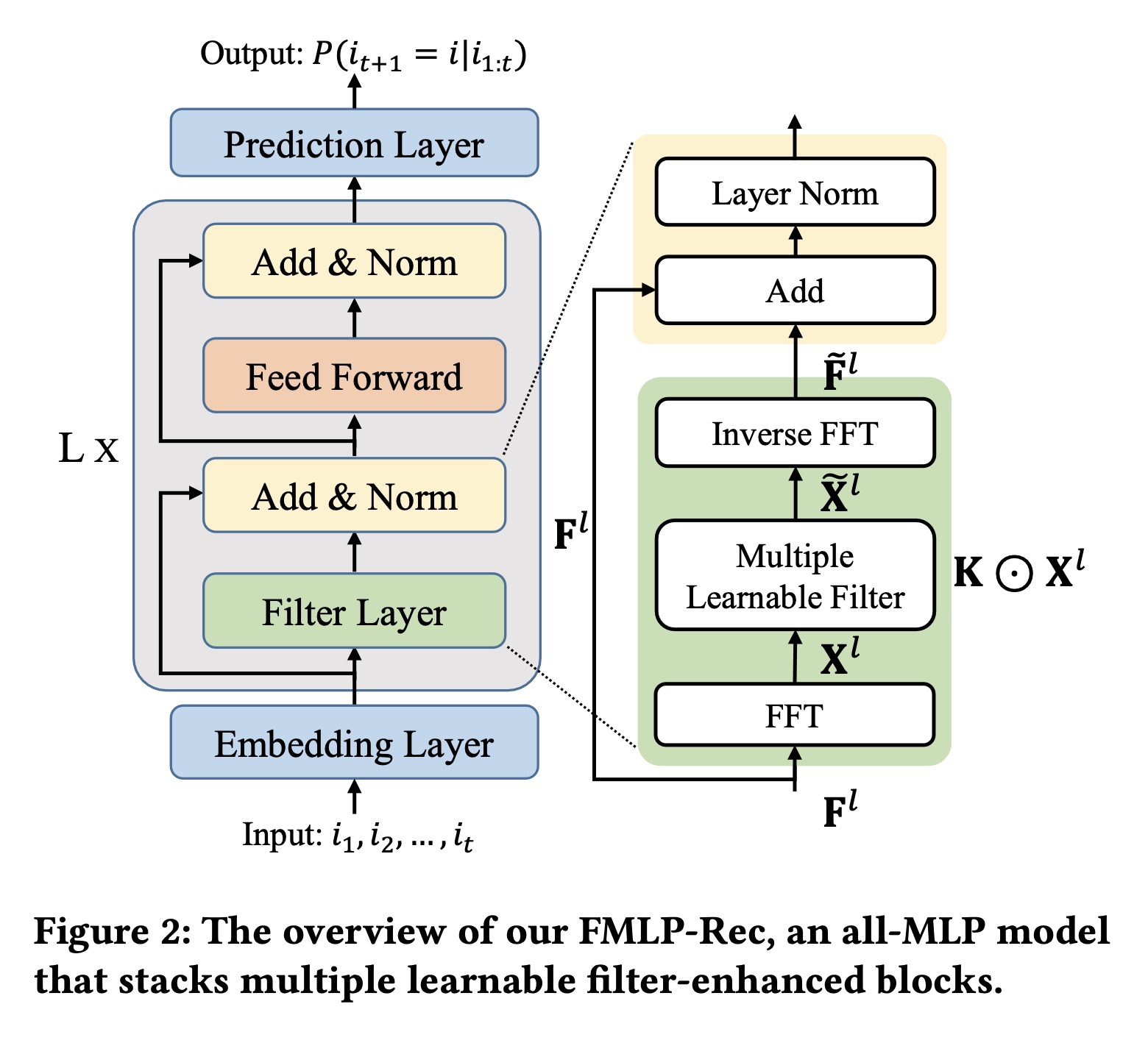 前面的实证结果表明,带有合适滤波算法(如 LPF)的 all-MLP 架构可以产生非常好的推荐性能。然而,以前的滤波算法通常需要领域知识或专家的努力来设计合适的滤波器并设置超参数(如滤波阈值)。如何有效地将滤波算法集成到现有的深度推荐框架中仍然是一个挑战。在本节中,我们提出一种用于序列推荐的 all-MLP 架构(名为 FMLP-Rec),它通过堆叠带有 learnable filters 的 MLP blocks ,能够针对各种序列推荐场景自动学习合适的滤波器。