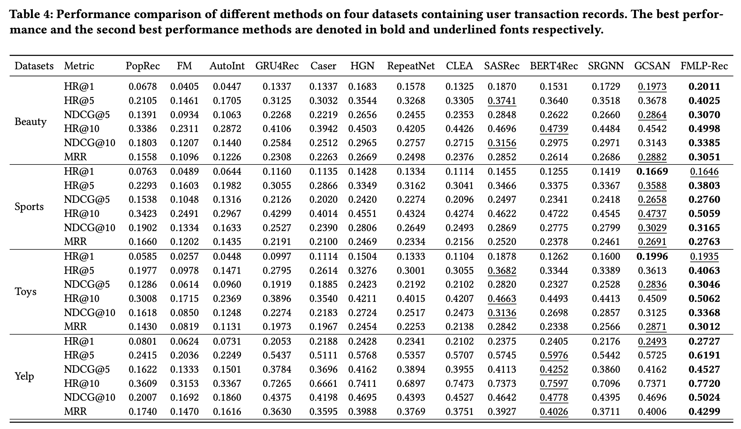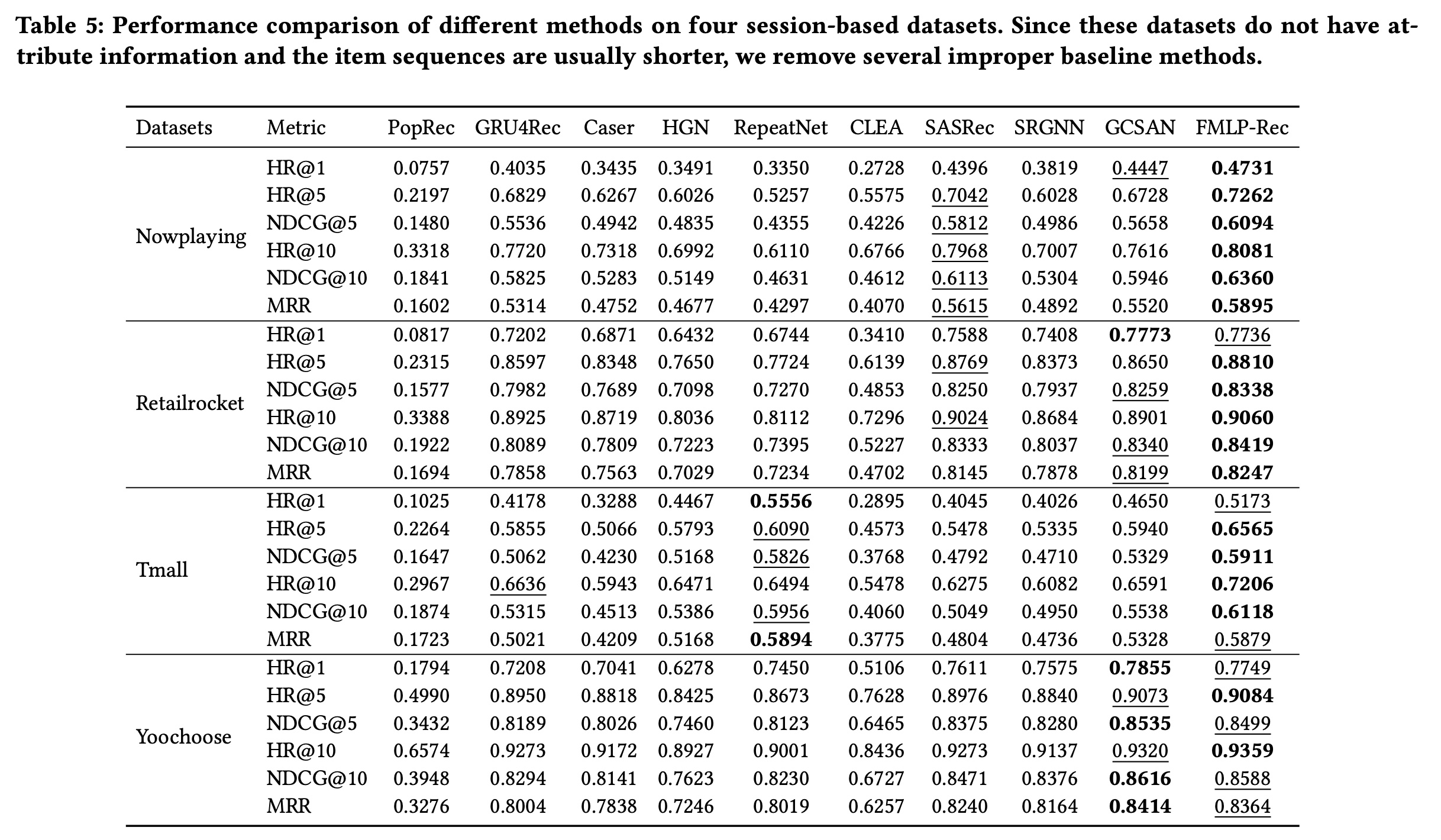不同方法在包含用户交易记录的数据集上的结果如 Table 4 所示,在基于会话的数据集上的结果如 Table 5 所示。基于这些结果,我们可以发现: