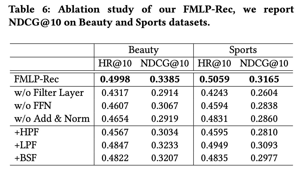 消融研究:我们提出的 FMLP-Rec 包含 filter layers 、前馈网络和 Add & Norm 操作。为验证每个组件的有效性,我们在 Beauty 和 Sports 数据集上进行消融研究,分析每个部分的贡献。此外,为验证 learnable filters 是否比经典滤波算法更有用,我们还进行了变体研究,用高通滤波器、低通滤波器、以及带阻滤波器替换 learnable filters 。