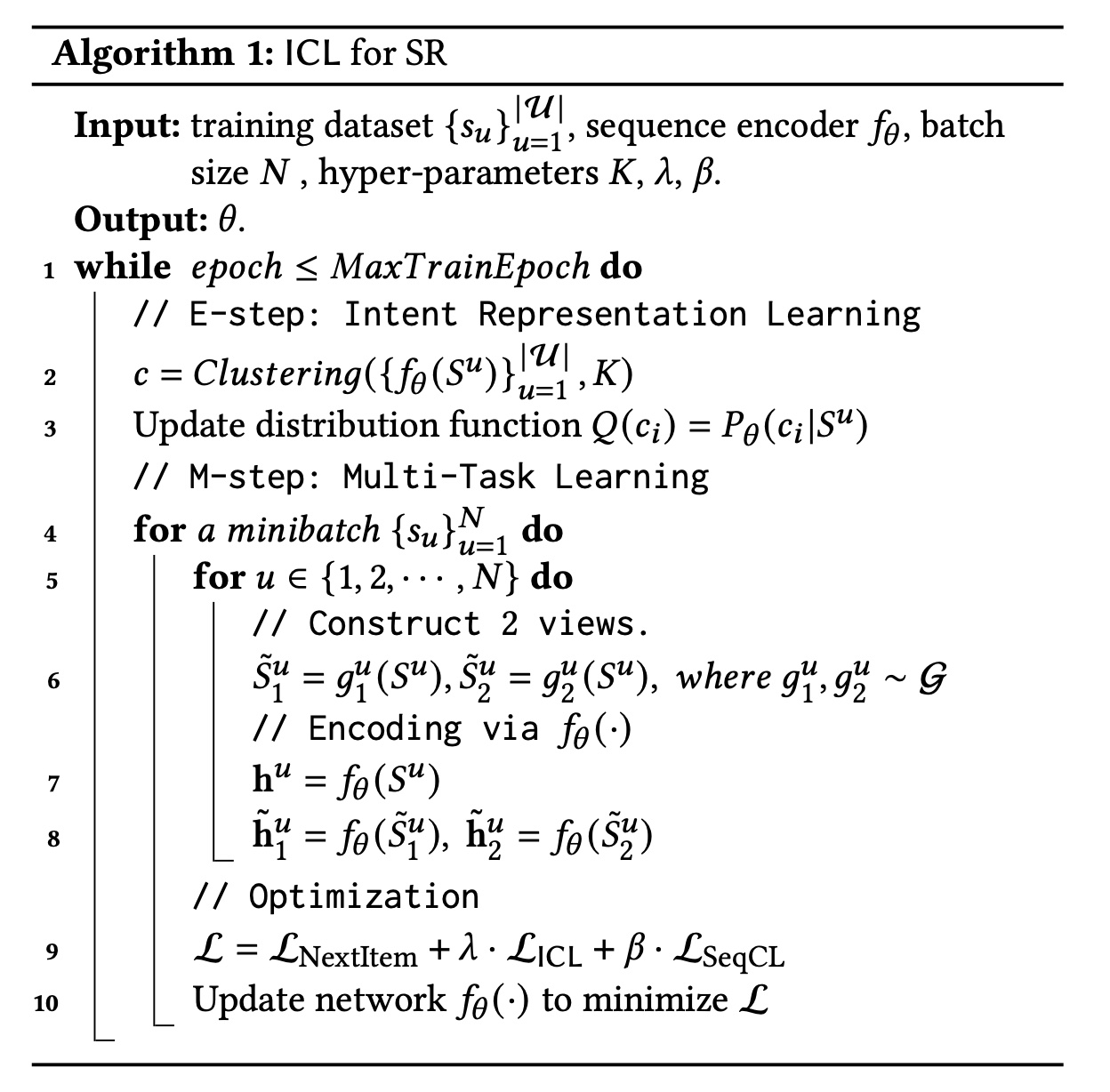 到目前为止,我们找到了 Intent Representa- tion Learning (E-step)和 Intent Contrastive SSL with FNM (M-step )之间交替优化模型,这遵循广义 EM 框架。我们将整个过程称为意图对比学习(Intent Contrastive Learning: ICL)。在每轮迭代中,