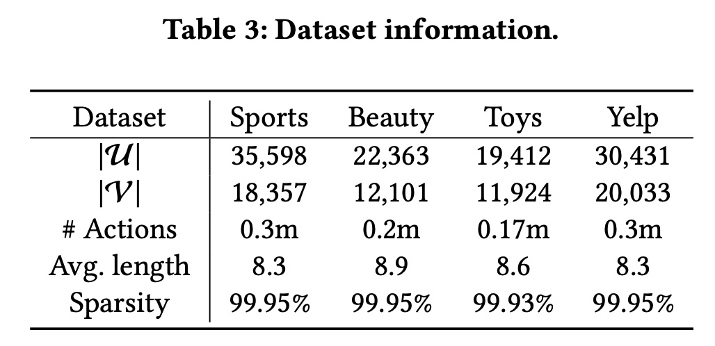 我们遵循文献 《Contrastive Learning for Sequential Recommendation》、《S3-rec: Self-supervised learning for sequential recommendation with mutual information maximization》 中的方法准备数据集。具体来说,我们只保留 “5-core” 数据集,其中所有用户和 items 至少有 5 次交互。Table 3 总结了数据集的统计信息。