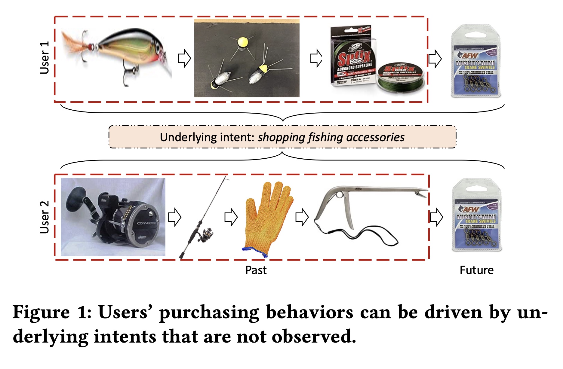 一般来说,深度序列推荐模型是通过深度神经网络基于用户的交互行为进行训练的,假设用户的兴趣取决于历史行为。然而,用户的消费行为可能会受到其他潜在因子的影响,即由他们的底层意图驱动。考虑 Figure 1 所示的例子,两个用户过去在 Amazon 上购买了一系列不同的 items 。鉴于这种截然不同的交互行为,系统会向他们推荐不同的 items 。然而,他们都是钓鱼爱好者,并且正在为钓鱼活动购物。结果,他们未来都购买了 “钓鱼转环”(fishing swivels )。如果系统知道这两个用户是为钓鱼活动购物,那么就可以推荐钓鱼常购买的 items ,比如 “钓鱼转环”。这促使我们挖掘用户之间共享的底层意图,并使用所学到的意图来指导系统提供推荐。