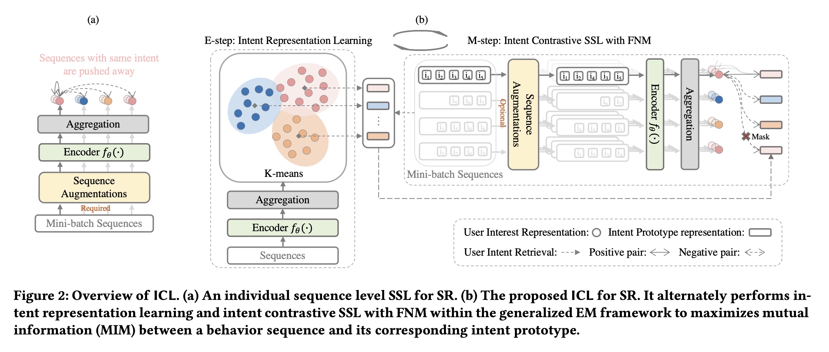 其中, mini-batch 中与具有相同意图的用户集合。我们将此称为 False-Negative Mitigation: FNM。Figure 2(b) 展示了 M-step 的工作原理。