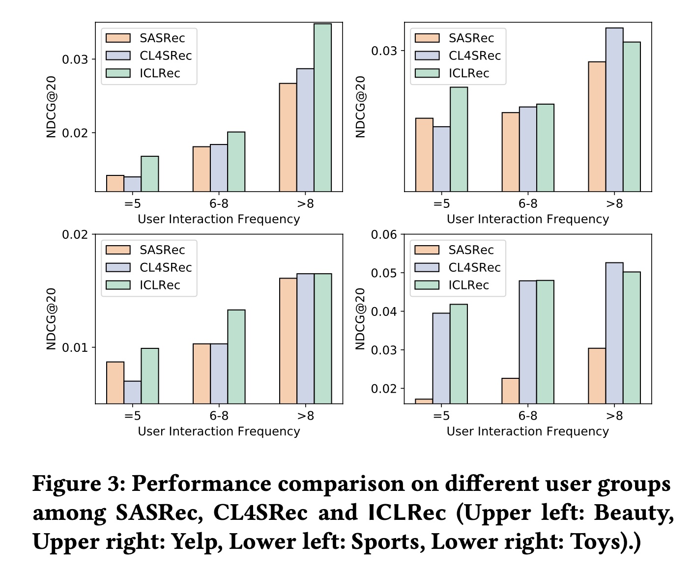 对用户交互频率的鲁棒性:用户 “冷启动” 问题是推荐系统经常面临的典型数据稀疏问题之一,即大多数用户的历史行为有限。为了检查 ICL 在这种情况下是否提高了鲁棒性,我们根据用户行为序列的长度将其分为三组,并保持行为序列的总数不变。在每组用户上独立训练和评估模型。Figure 3 展示了在四个数据集上的比较结果。我们观察到: