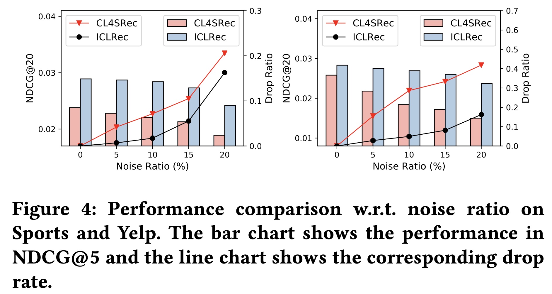 添加噪声数据会降低 CL4SRec 和ICLRec 的性能。