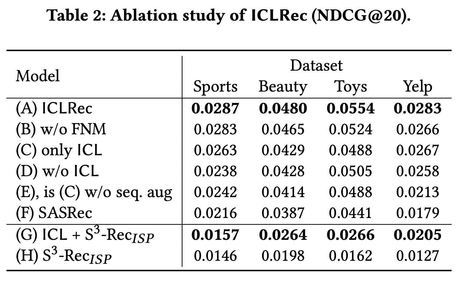 由于 ICL 是一种与模型无关的学习范式,我们还在微调阶段将 ICL 添加到 S3-Rec_ISP模型中,以进一步验证其有效性。结果如 Table 2 的 (G) - (H) 所示。我们发现模型也从 ICL 目标中受益。在四个数据集上,NDCG@20 的平均提升为 41.11%,这进一步验证了 ICLRec 的有效性和实用性。
