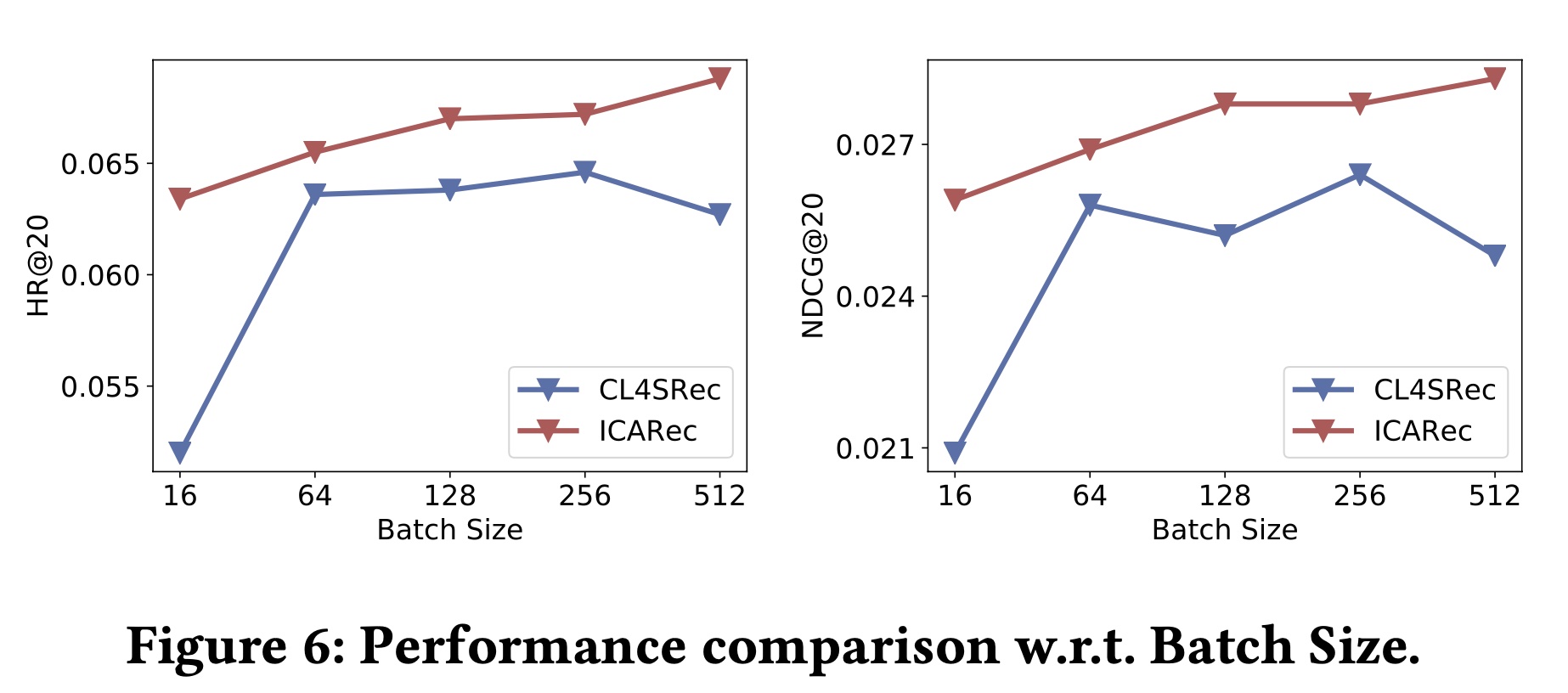 Figure 6 显示了 CL4SRec 和所提出的 ICLRec 在 Yelp 上相对于 batch size 的性能。我们观察到: