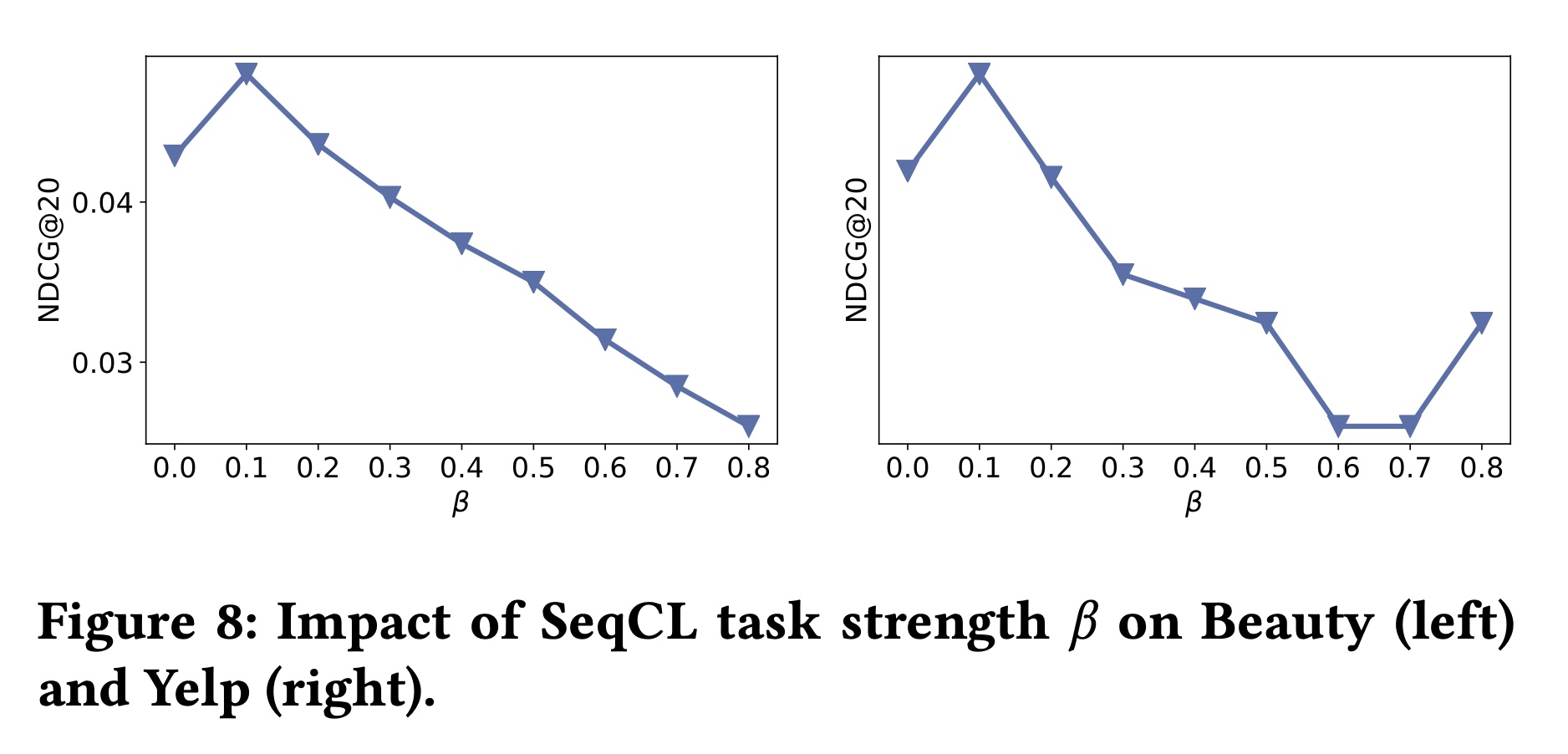 (1):在所有用户组中,所提出的 ICLRec 始终比 SASRec 表现更好,而当用户行为序列较短时,CL4SRec 在 Beauty 和 Yelp 数据集上未能超过 SASRec。这表明 CL4SRec 需要单个用户行为序列足够长,以提供 “完整” 的信息用于辅助监督,而 ICLRec 通过利用 user intent 信息减少了这种需求;因此即使用户的历史交互有限,也能始终有益于 user representation learning。