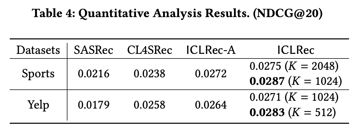 比较 (E) - (F),我们发现 ICL 可以在不进行序列增强的情况下进行对比自监督学习,并且性能优于 SASRec。而 CL4SRec 需要序列增强模块来进行对比自监督学习。