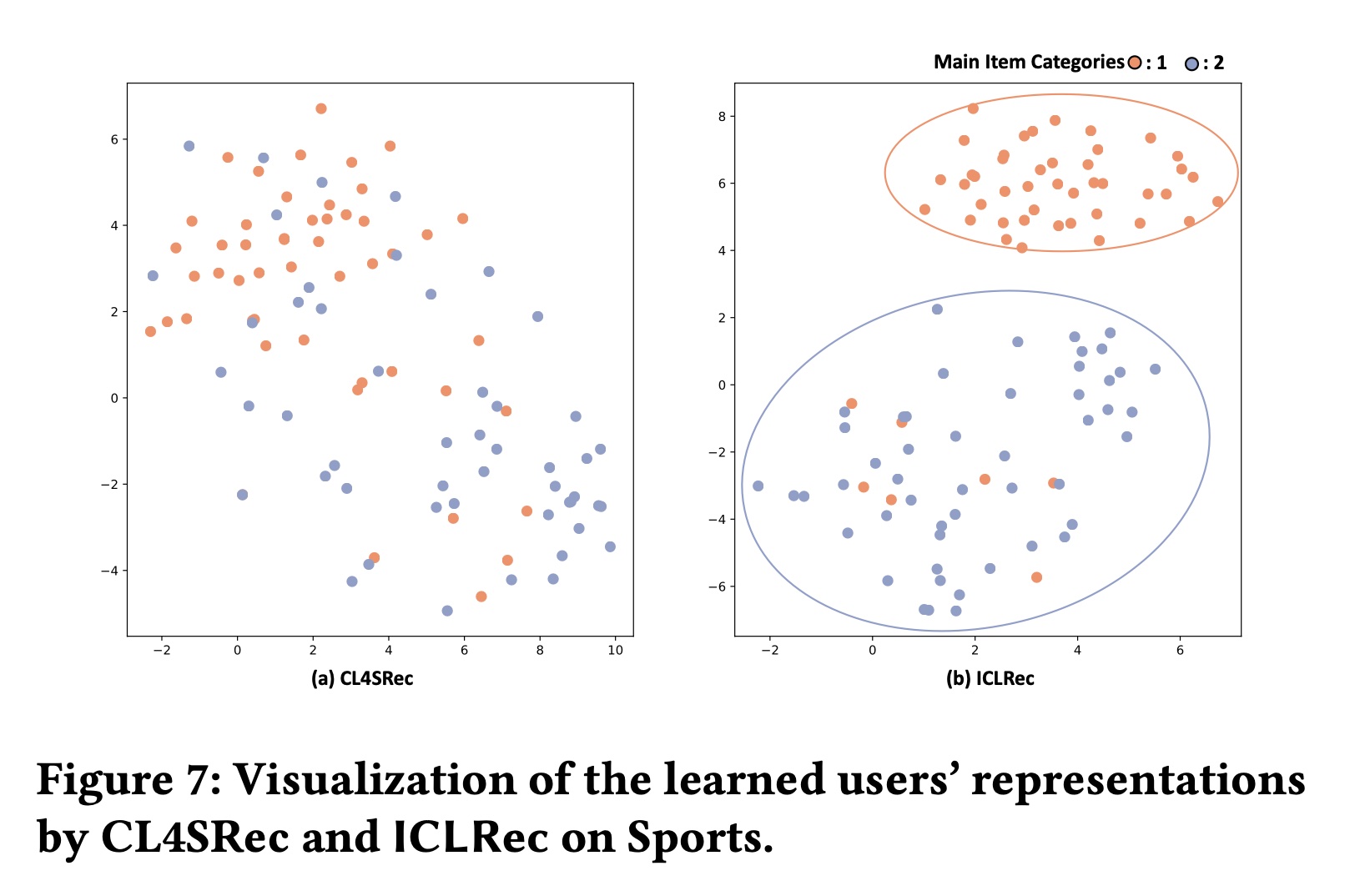 定性分析:我们还通过 t-SNE 可视化学到的 users’ representations ,将提出的 ICLRec 与 CL4SRec 进行比较。具体来说,我们随机抽样了 100 位曾经与某个 category 或另一个 category 的 items 互动的用户。这 100 位用户过去也与其他类别的 items 互动过。我们在 Figure 7 中通过t-SNE可视化学到的 users’ representations 。从 Figure 7 中我们可以看到:与 CL4SRec 相比,ICLRec 学到的 users’ representations 旨在将与同一类别 items 互动的用户拉近彼此,同时将其他用户推得更远。这反映出 ICL 学到的 representations 可以捕获更多的语义结构,因此提高了性能。