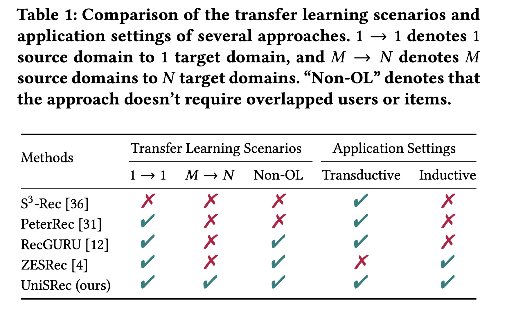 然而,这些方法都没有探索如何在多个弱相关、或不相关的域上预训练通用的 item and sequence representations。相比之下,我们的方法可以从多个源域的混合数据中学习更具迁移性的 representations ,并很好地泛化到目标域。这些方法的比较如 Table 1 所示。