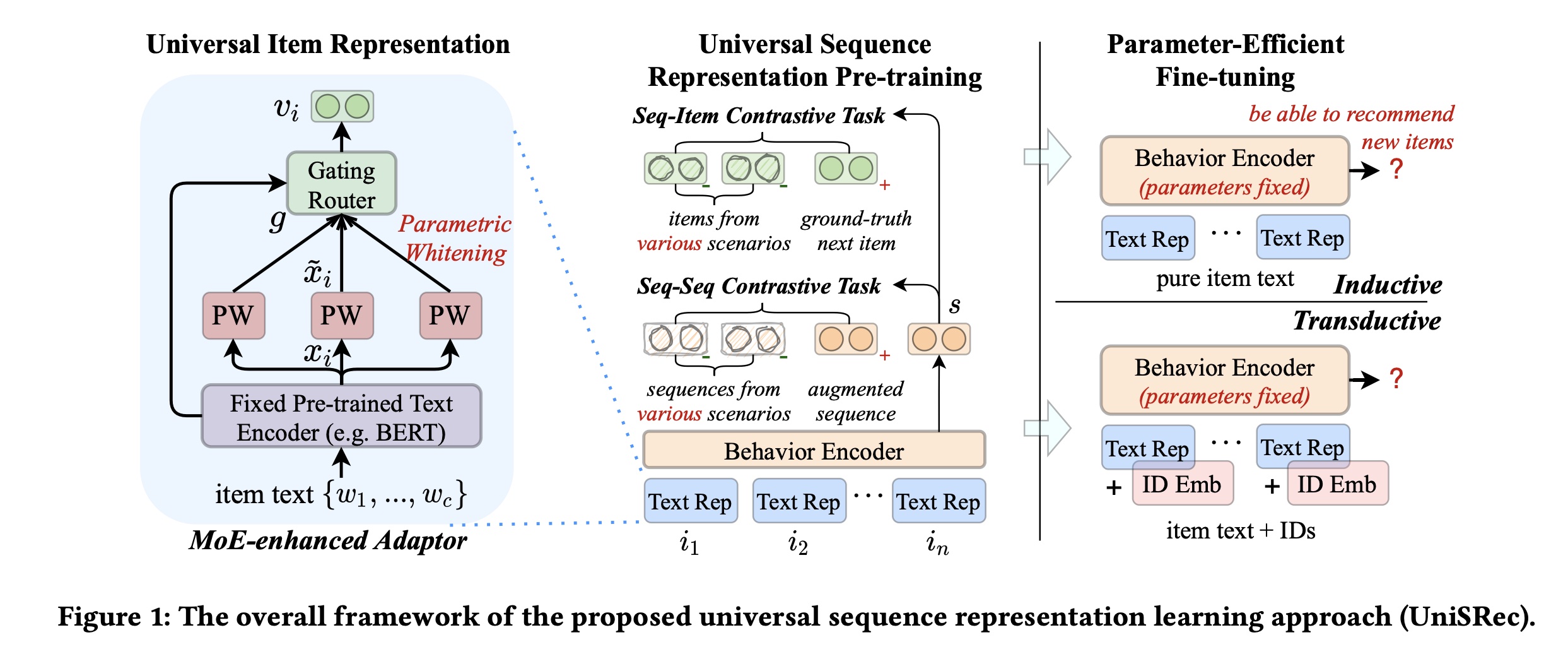 基于上述方法,pre-trained 模型可以在归纳式或直推式设置下,以 parameter-efficient 的方式有效地迁移到新的推荐场景中。所提出的 UniSRec 方法的整体框架如 Figure 1 所示。