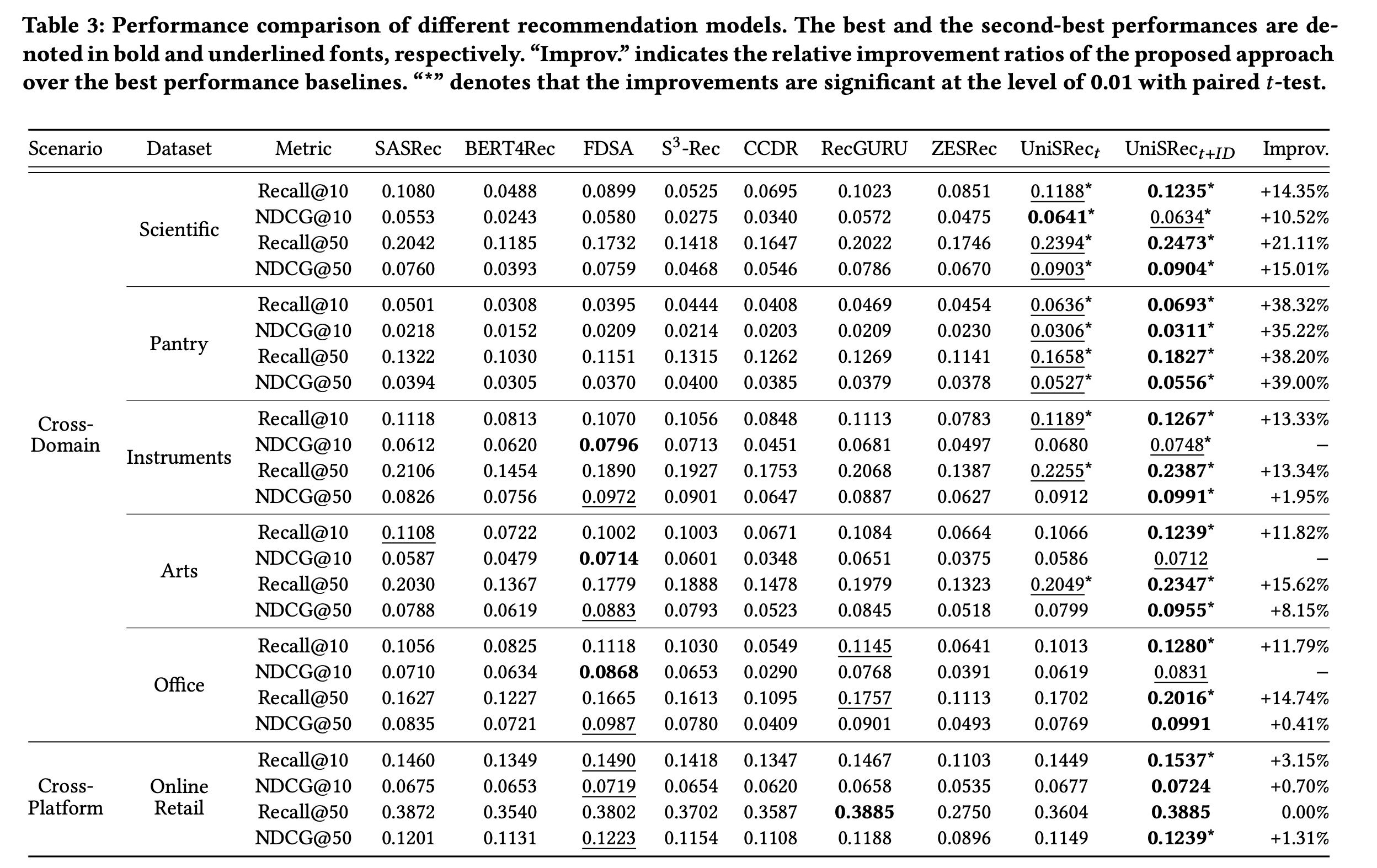 2) UniSRec_t+ID:表示在直推式 setting 下同时使用 item ID 和 item text 微调的模型。