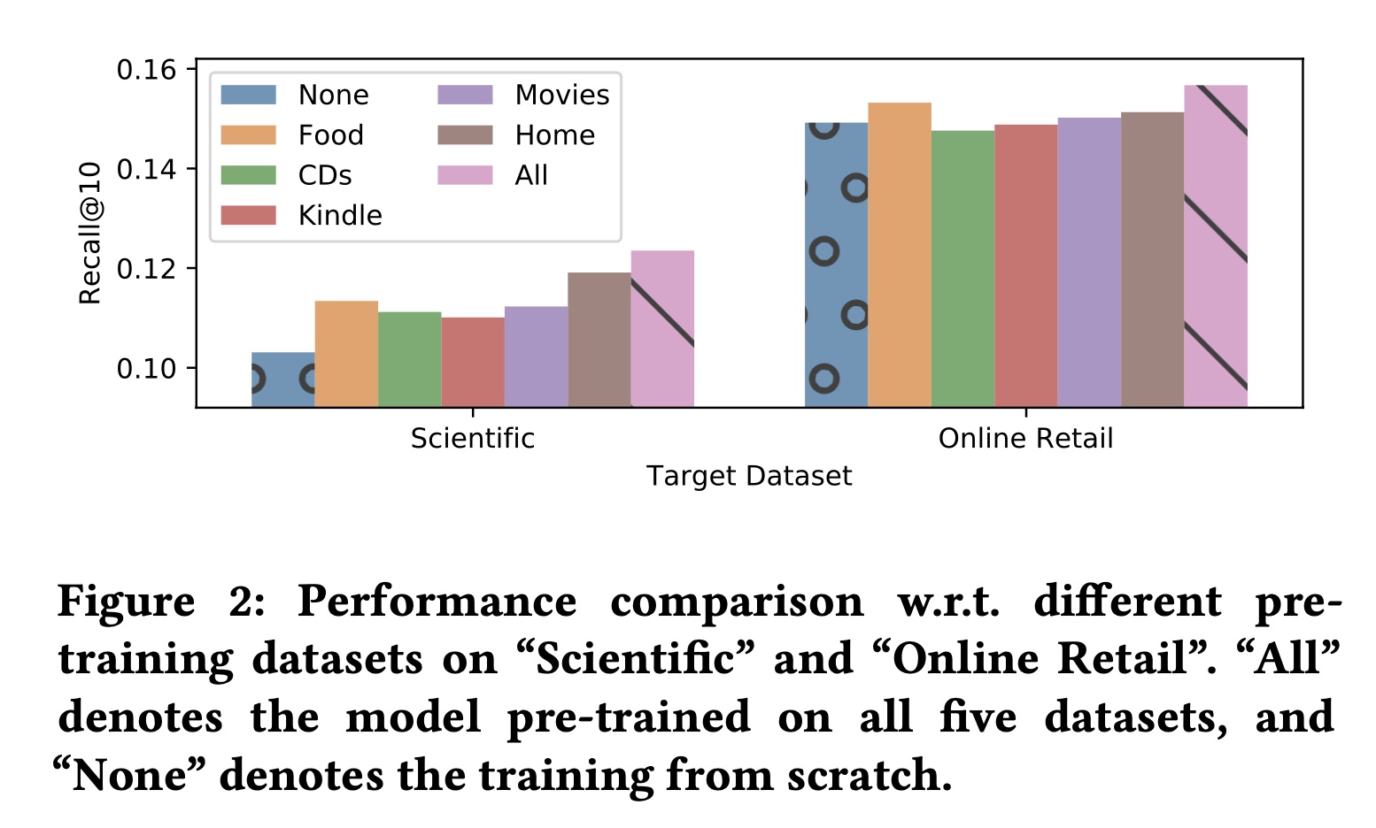 可以看出:在所有五个数据集上预训练的模型比在单个数据集上预训练、或未进行预训练的模型表现更好。结果表明,通过所提出的universal sequence representation learning 方法,pre-trained model 可以从多个源域中捕获 semantic sequential patterns ,从而提升在目标域或平台上的推荐效果。