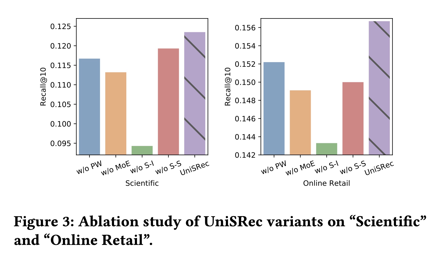 所提方法 UniSRec 及其变体的实验结果如 Figure 3 所示。可以观察到:
