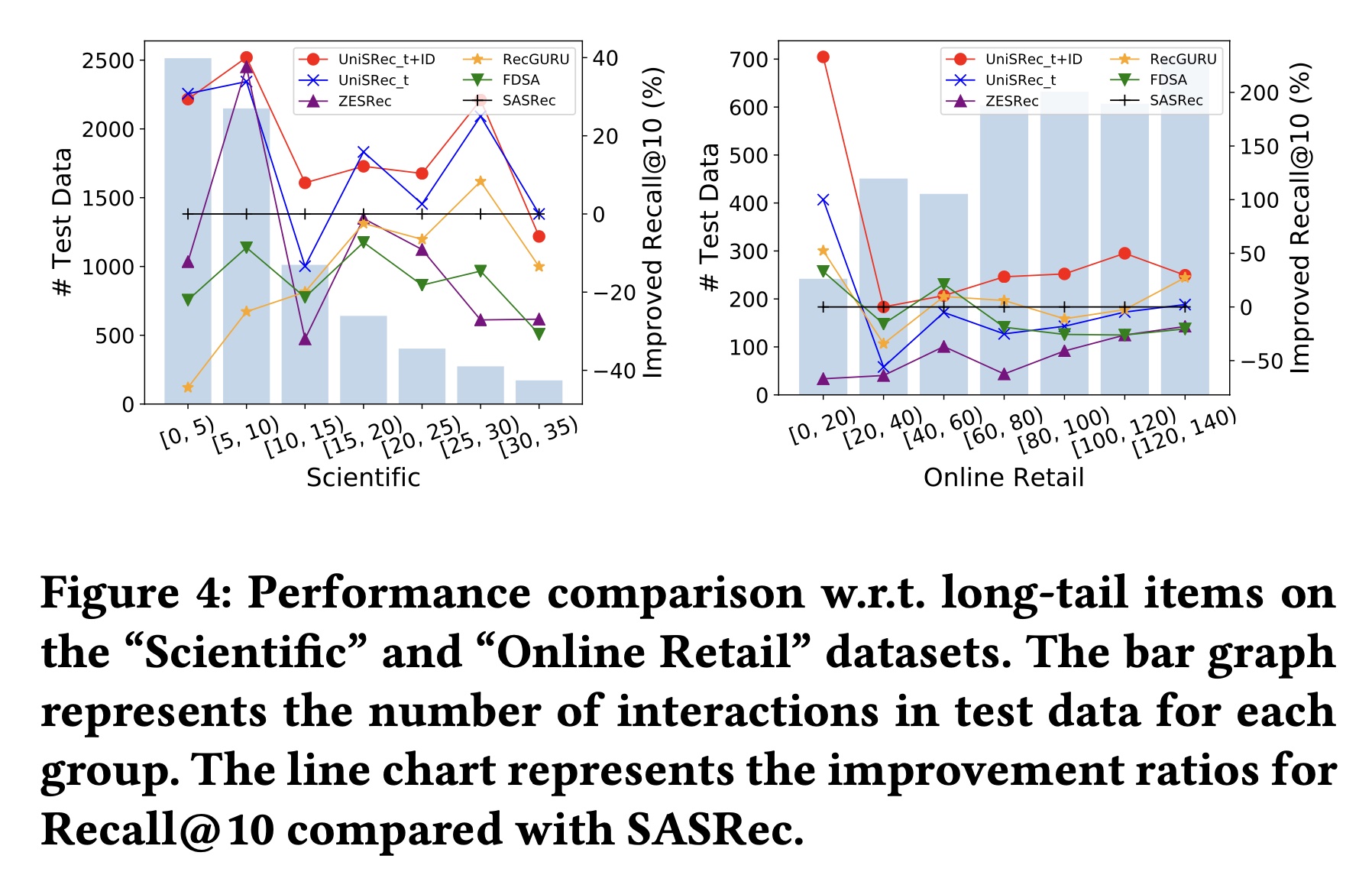 从 Figure 4 中可以观察到:在大多数情况下,所提方法优于其他基线模型,特别是当 ground truth item 不热门时,例如 Industrial and Scientific 数据集上的 [0, 5) 组和 Online Retail 数据集上的 [0, 20)组。结果表明,长尾 items 可以从学到的通用 sequence representations 中受益。