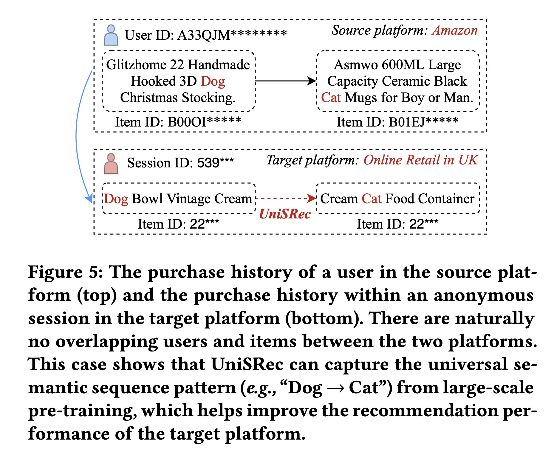 这个例子分别展示了来自 Amazon 和 Online Retail 的两个不同用户的两个短序列。可以观察到,我们的方法不依赖于显式的 item IDs 来捕获用户偏好。相反,它试图通过对 sequential patterns 进行建模来捕获 semantic associations。特别是,这两个短序列对应于 item title 中从 "dog" 这个关键词到 "cat" 这个关键词的语义转换。这表明我们的方法可以从通用文本语义的角度捕获跨平台的通用 sequential patterns 。