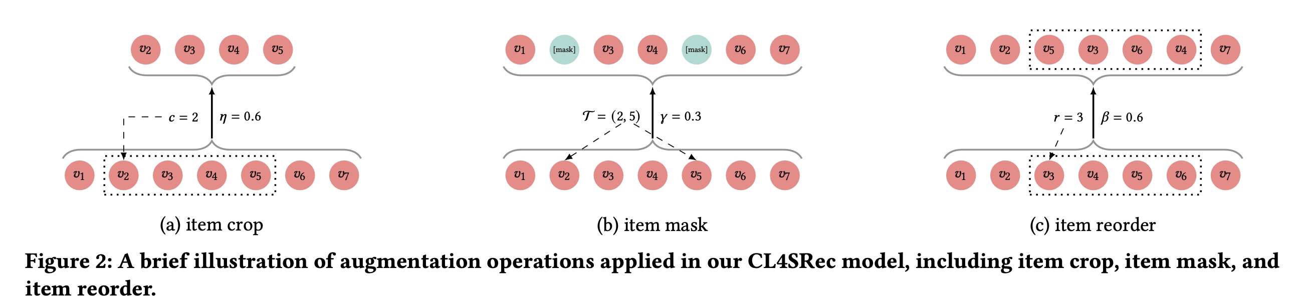 我们提出了三种不同的数据增强方法,包括裁剪(crop)、掩码(mask)和重排序(reorder),以构建用户序列的不同视图。
