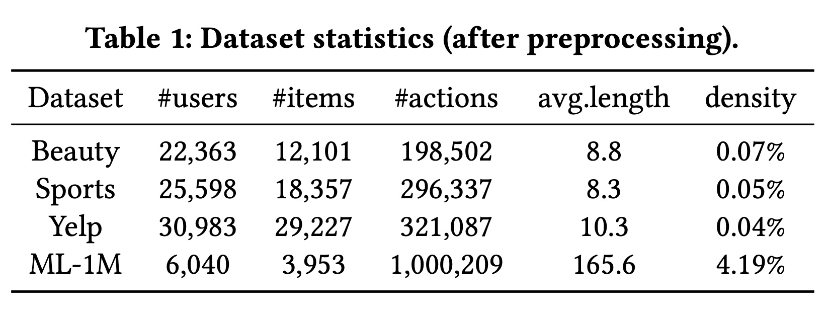 对于数据集预处理,我们遵循 《Self-attentive sequential recommendation》、《S3-Rec: Self-Supervised Learning for Sequential Recommendation with Mutual Information Maximization》 中的常见做法。如果存在数值评分或评论则 label 为 1,否则 label 为 0。然后,对于每个用户,我们丢弃重复的交互,并按交互 time step 的先后顺序对他们的 historical items 进行排序,以获得用户交互序列。值得一提的是,为了确保每个 user/item 有足够的交互,我们遵循 《Factorizing Personalized Markov Chains for Next-Basket Recommendation》、《S3-Rec: Self-Supervised Learning for Sequential Recommendation with Mutual Information Maximization》 中的预处理过程,只保留 "5-core" 数据集。我们迭代地丢弃交互记录少于 5 条的用户和 items 。处理后的数据统计信息总结在 Table 1 中。