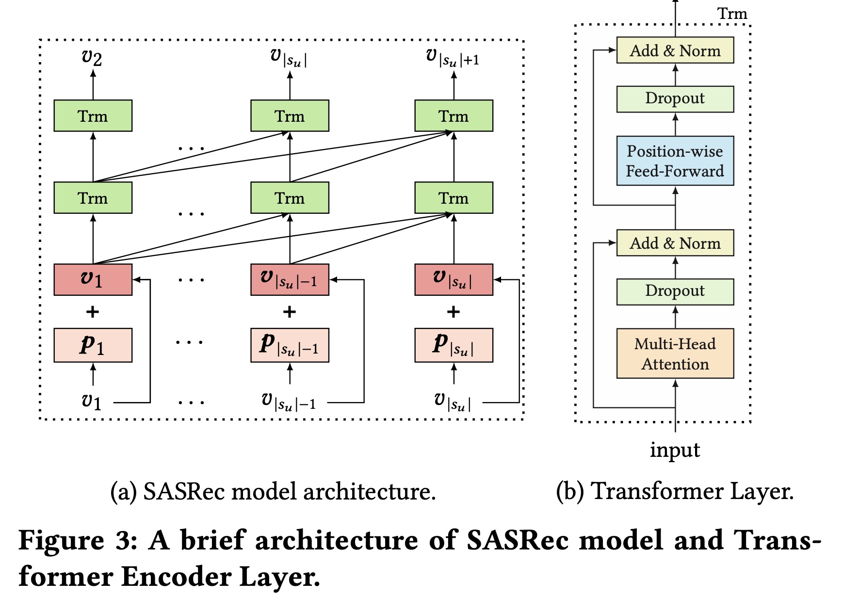在本小节中,我们描述如何通过堆叠 Transformer encoder 对用户历史序列进行建模。在本文中,我们使用 SASRec 模型的架构,该模型应用单向 Transformer encoder ,并在序列推荐任务中取得了有希望的结果 。Transformer encoder 由三个子层组成:embedding Layer 、多头自注意力模块、以及 position-wise feed-forward Network ,Figure 3简要说明了这些组件。
