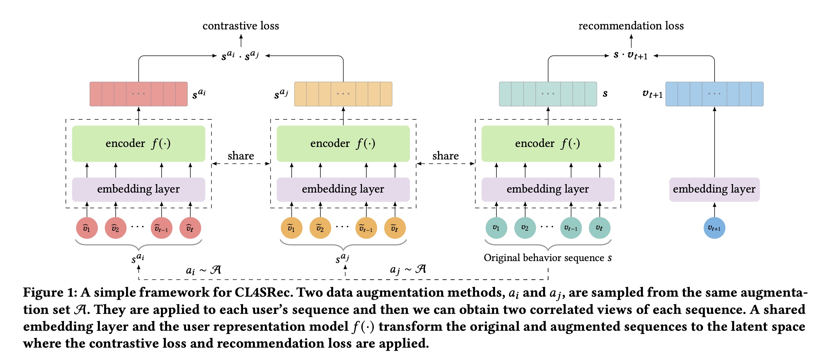 受用于学习 visual representation 的 SimCLR 框架的启发,我们探索将对比学习算法应用于序列推荐任务,以获得强大的 user representation model。该框架包含三个主要组件,包括随机数据增强模块、user representation encoder 、以及对比损失函数。Figure 1 的左侧展示了该框架。