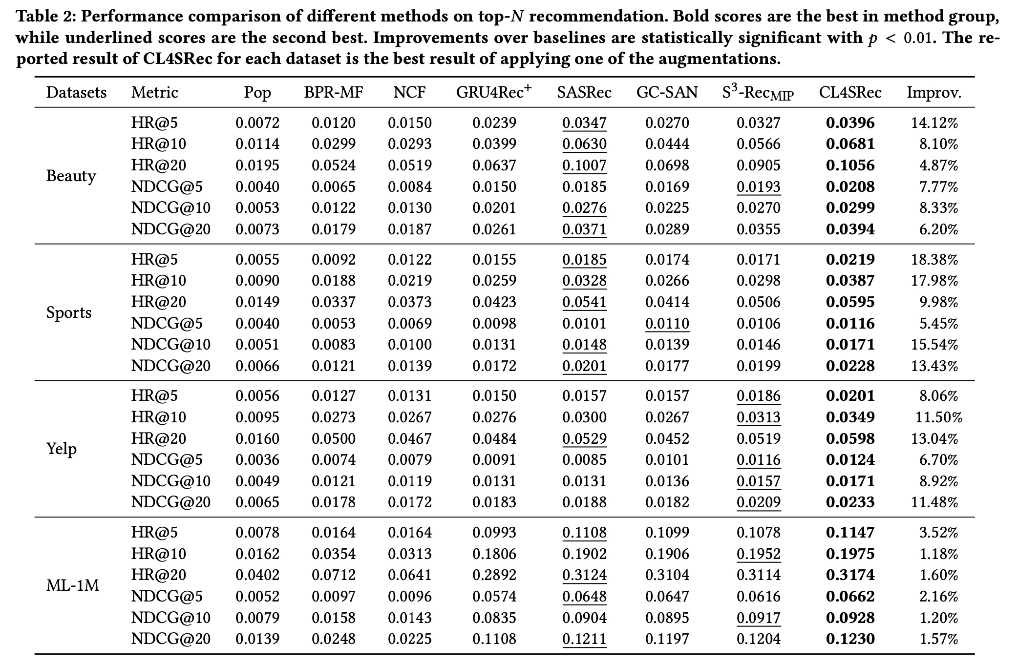 为了回答 RQ1,我们将 CL4SRec 的性能与上述基线方法进行比较。Table 2 总结了所有模型在四个数据集上的最佳结果。请注意,improvement 列是 CL4SRec 相对于第二好的基线方法的性能提升。由于空间限制,Table 2 中报告的 CL4SRec 结果是使用三种增强方法之一的最佳结果。基于实验结果,我们可以观察到: