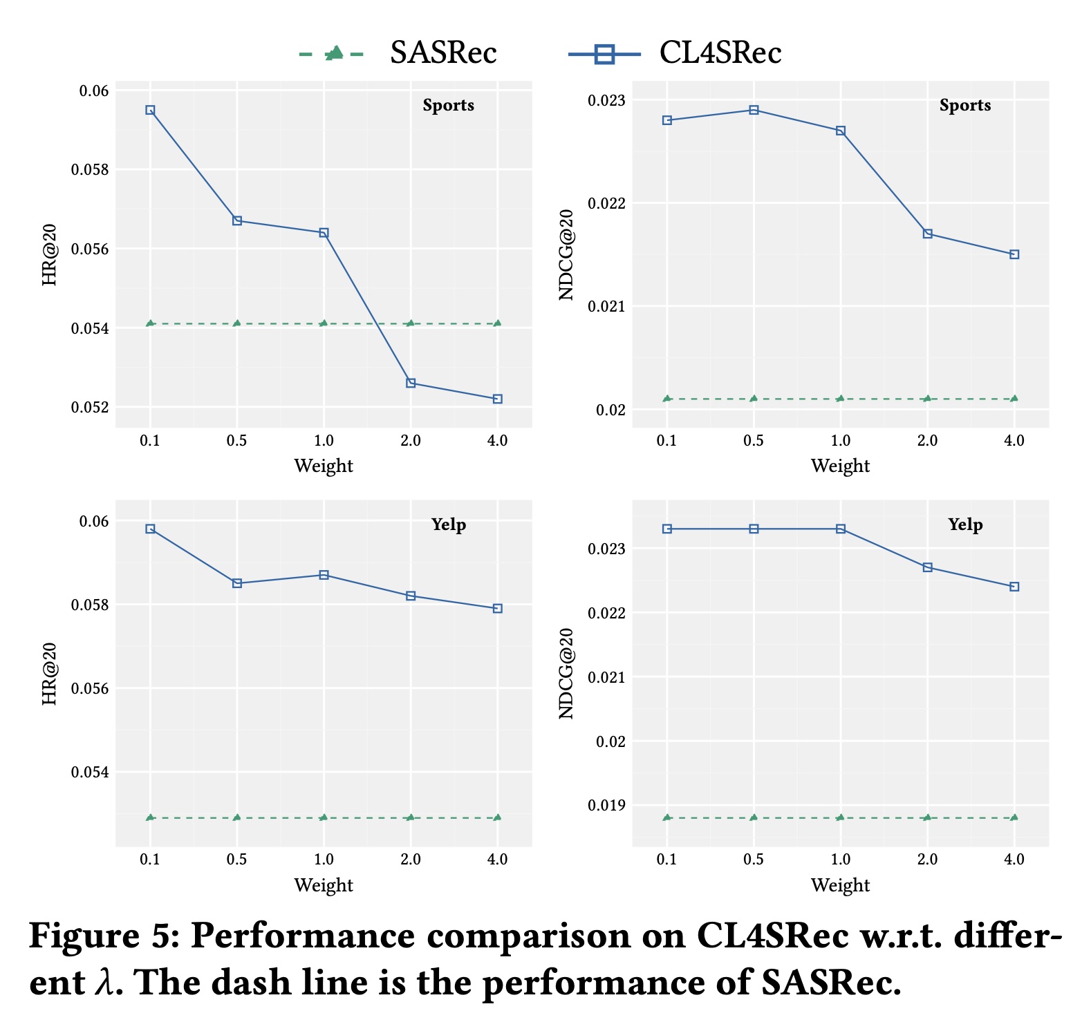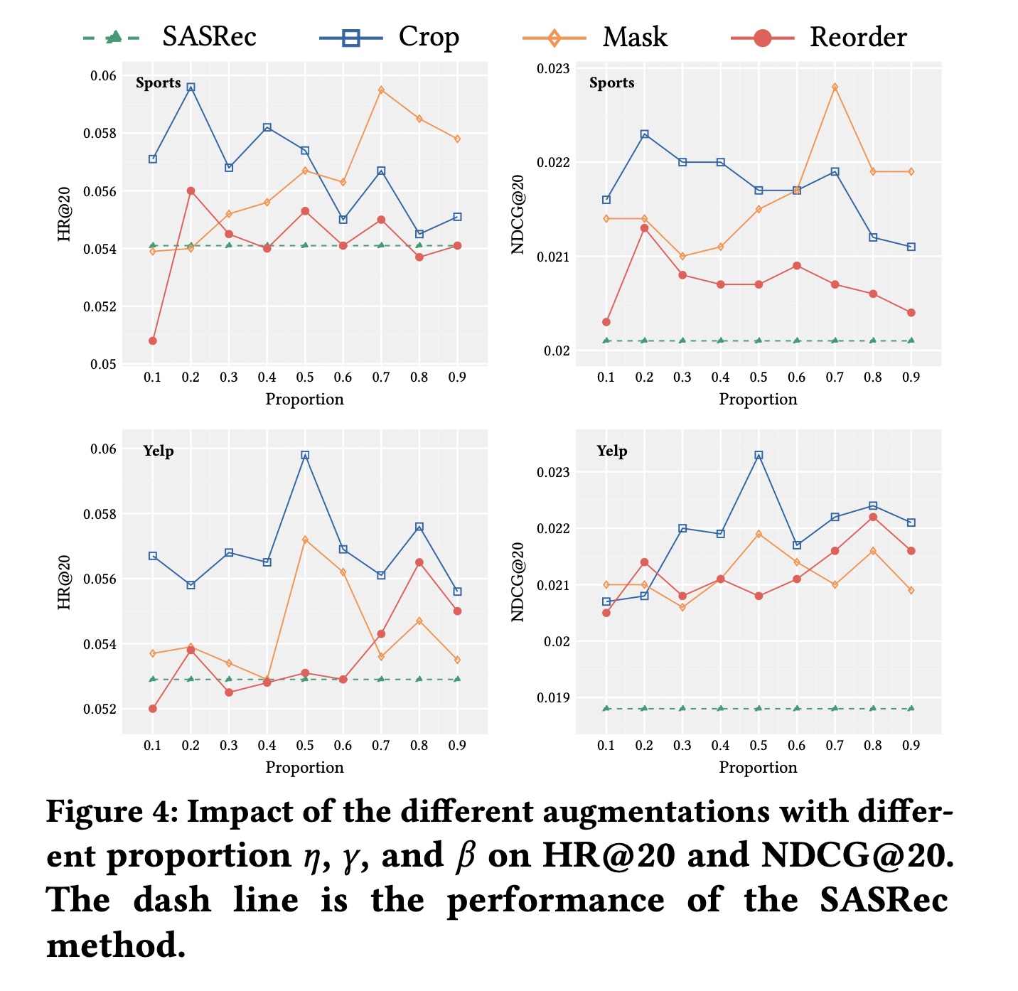 另一方面,使用我们提出的对比学习损失,CL4SRec 在所有数据集上,在所有增强方法下都始终优于 SASRec_aug。这验证了我们的对比学习组件在提供显著自监督信号方面的有效性,如上文所述。