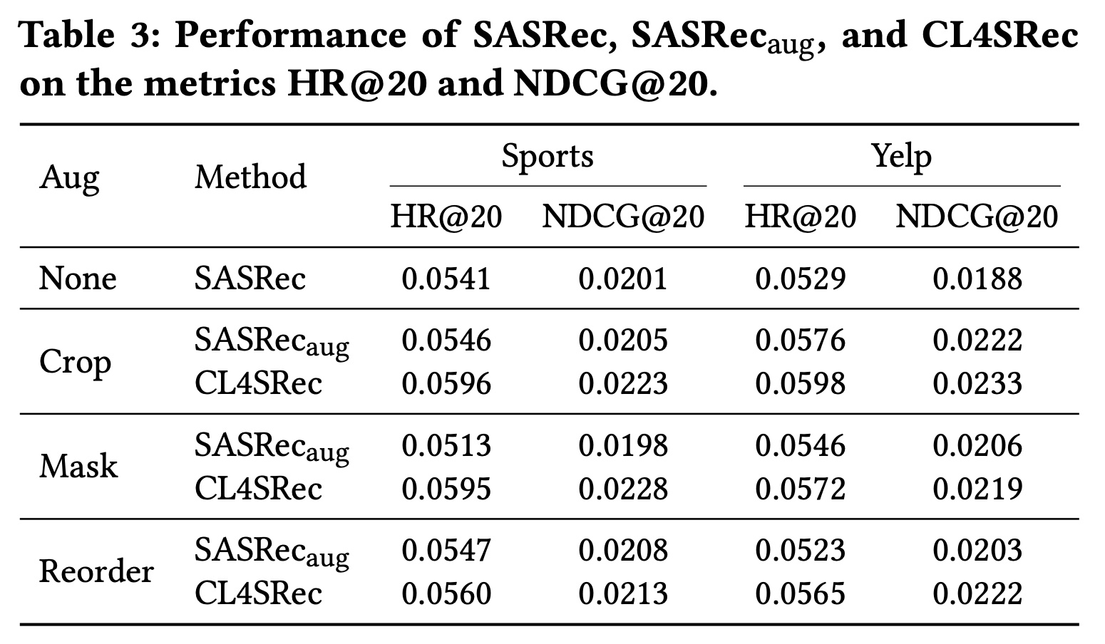 Table 3 展示了 SASRec、SASRec_aug 和 CL4SRec 的结果。我们在这个表中观察到一些趋势。
