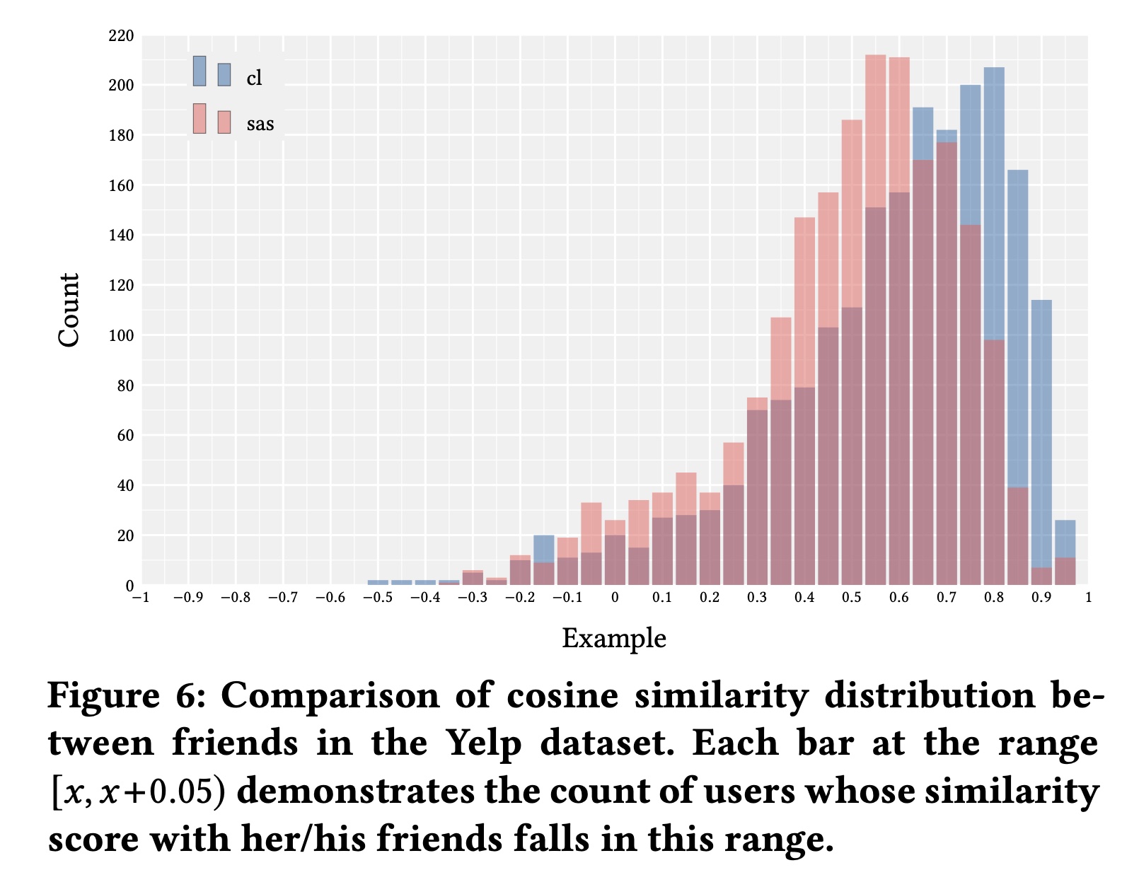 如前所述,与其他 SOTA 的基线方法相比,CL4SRec 可以在 user behavior sequence level 推断出更好的 representations 。在本小节中,我们试图验证 CL4SRec 是否真的能解决这个问题。我们利用 Yelp 数据集提供的好友关系来探索,如果用户是好友,他们在潜在空间中是否更接近。我们使用余弦函数来衡量相似度。请注意,我们在训练过程中不使用这类信息。