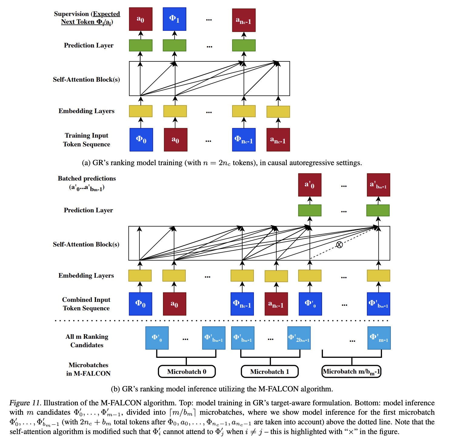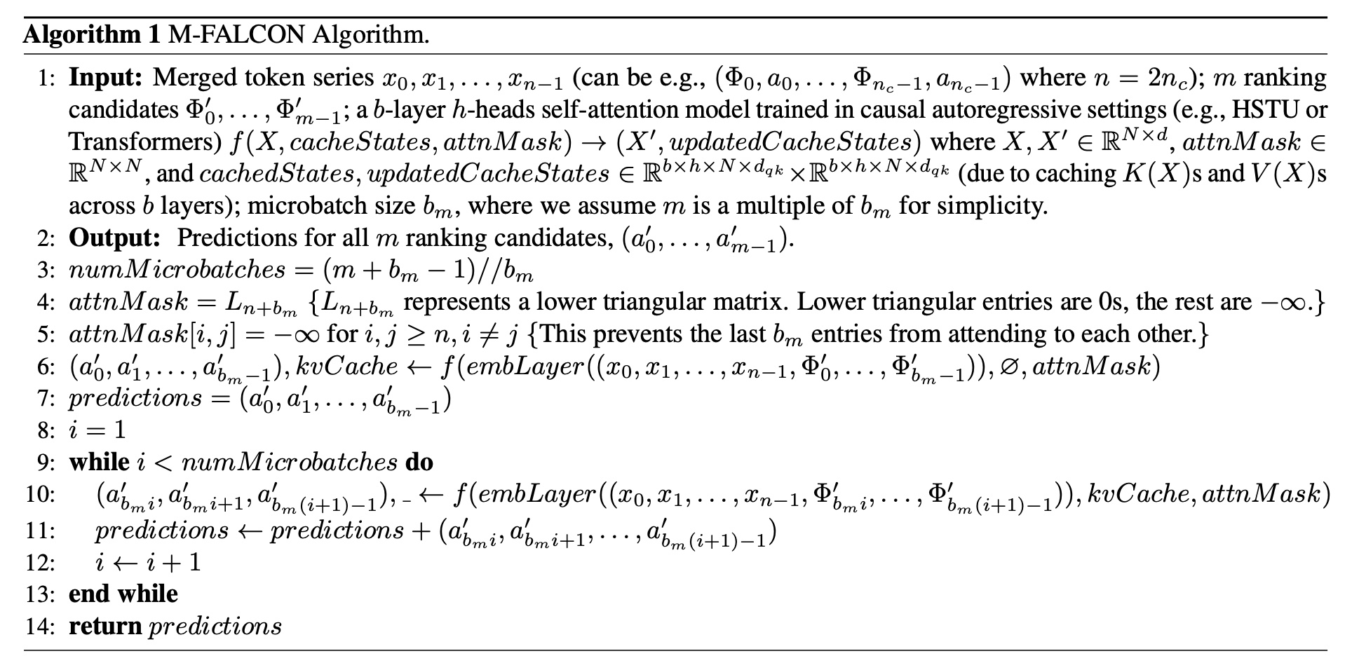algorithm 1 如 Figure 11 所示,以帮助理解。我们指出,M-FALCON 不仅适用于 HSTU 和 GR,而且可广泛应用于其他基于自注意力架构的 target-aware causal autoregressive settings的 inference optimization 算法。
