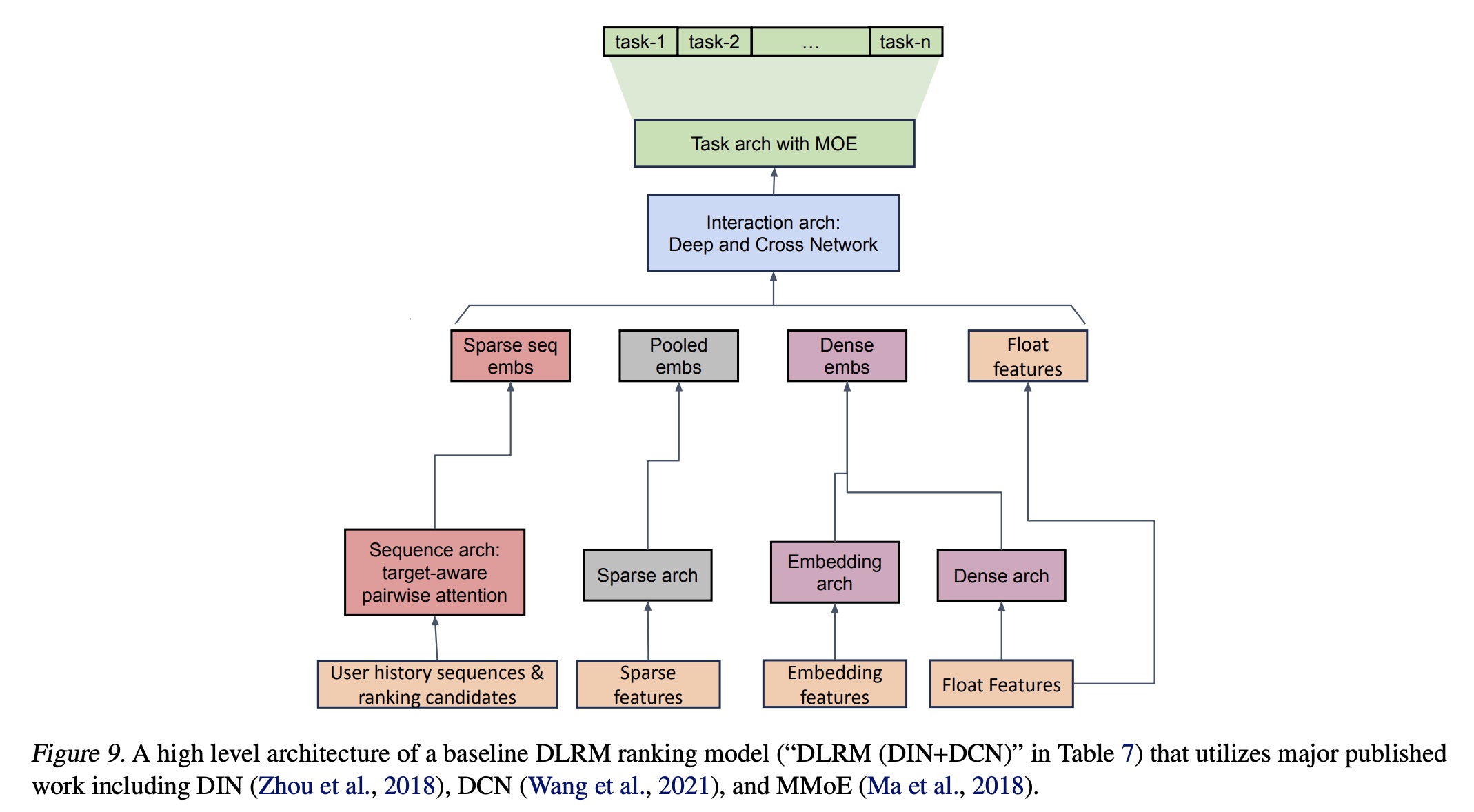 尽管由于保密原因我们无法披露确切 settings,但据我们所知,我们的 baseline 代表了整合最新研究后的最佳已知 DLRM 方法之一。为了验证这一说法并帮助读者理解,我们在 Table 7 中报告了基于相同特征但仅使用主要已发表成果(包括 DIN、DCN 和 MMoE)的典型配置(“DLRM (DIN+DCN)”),其组合架构如 Figure 9 所示。该 setup 在 main E-Task 的 NE 上比我们的 production DLRM steup 显著差 0.71%,在 main C-Task 的 NE 上差 0.57%(0.1% 的 NE 变化即视为显著,如实验章节所述)。