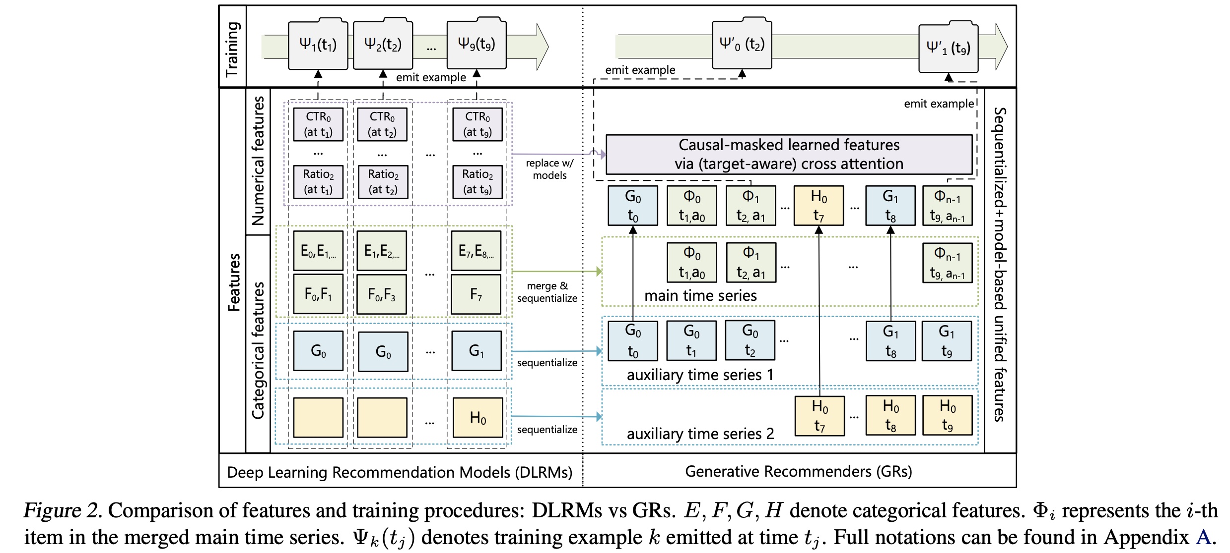 现代 DLRM 模型通常使用大量的 categorical (即,'sparse')特征和 numerical(即,'dense')特征进行训练。在 GRs 中,我们将这些特征整合并编码为一条单一的统一时间序列(single unified time series ),如 Figure 2 所示。