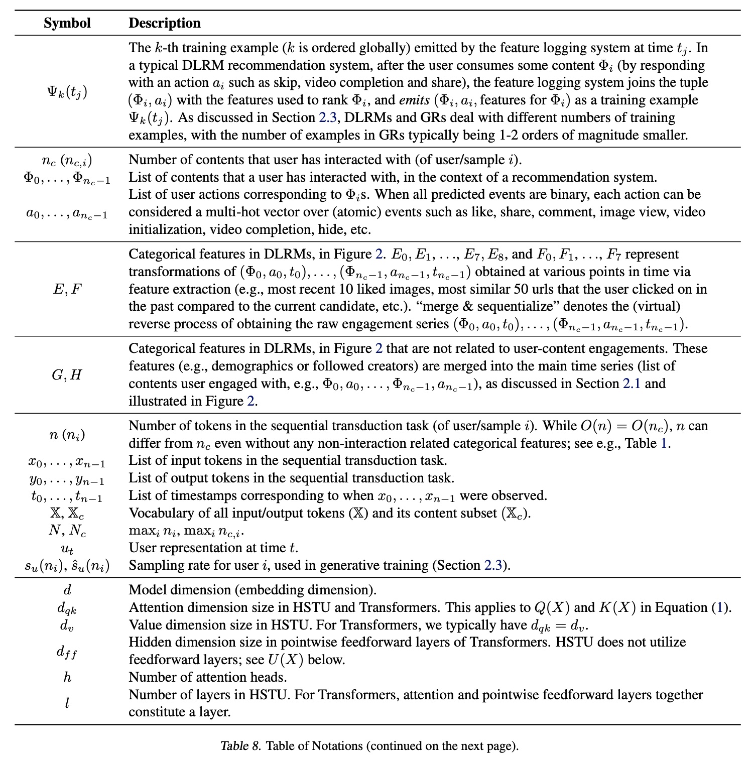 从问题公式的角度,我们认为上述所有工作均属于 DLRMs 的范畴,即使其模型架构、使用的特征和损失函数与附录 B.1.1 中讨论的学术序列推荐研究有显著差异。值得注意的是,在本文之前,工业界尚未有成功的 fully sequential ranking settings 的应用,尤其是在十亿日活跃用户(daily active users: DAU)规模下。