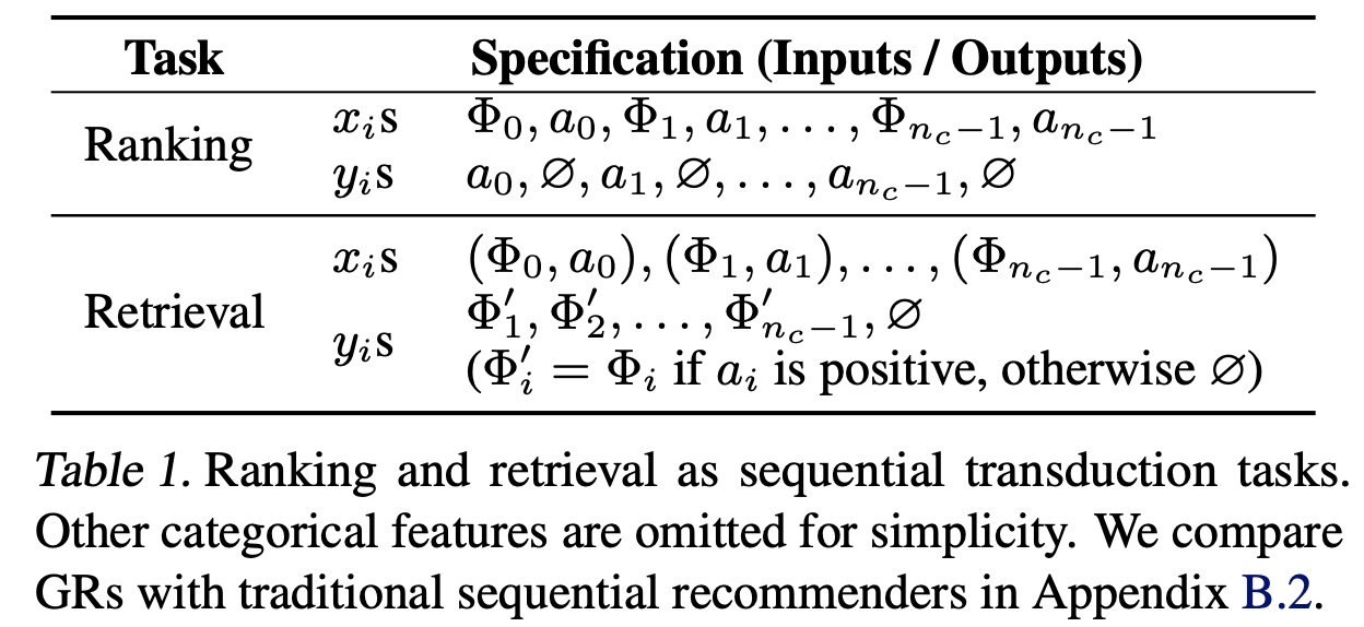 在因果自回归(causal autoregressive)的设置中,标准的 ranking 和 retrieval 任务可以定义为 sequential transduction 任务(Table 1 )。我们有以下观察: