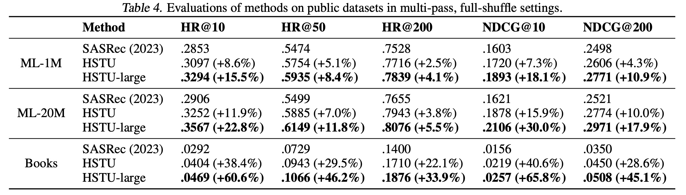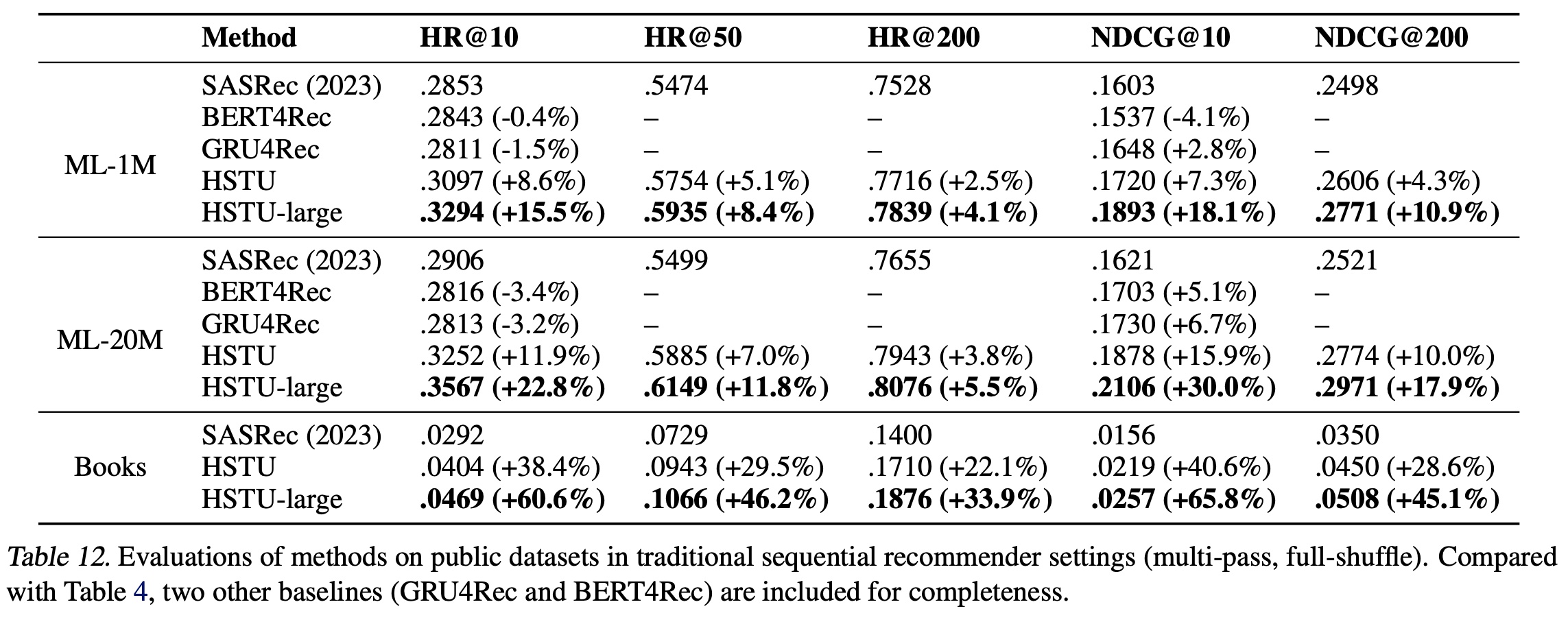 结果如 Table 12 所示。我们复用了 《Turning dross into gold loss: is bert4rec really better than sasrec?》 在 ML-1M 和 ML-20M 数据集上报告的 BERT4Rec 和 GRU4Rec结果。由于使用了 sampled softmax loss ,我们将负样本数量固定( ML-1M 和 ML-20M 为 128,Amazon Books 为 512),以确保方法间的公平比较。