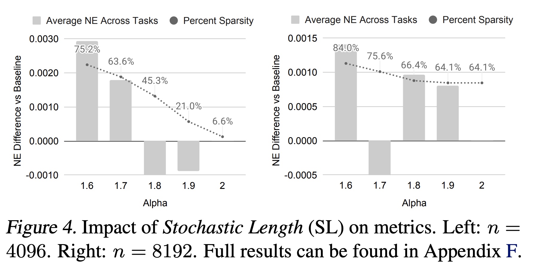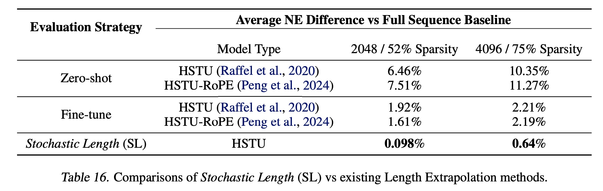 在 Table 16 中,我们报告了训练期间引入 data sparsity 的模型((Stochastic Length 、zero-shot、fine-tuning)与在 full data 上训练的模型之间的 NE 差异。