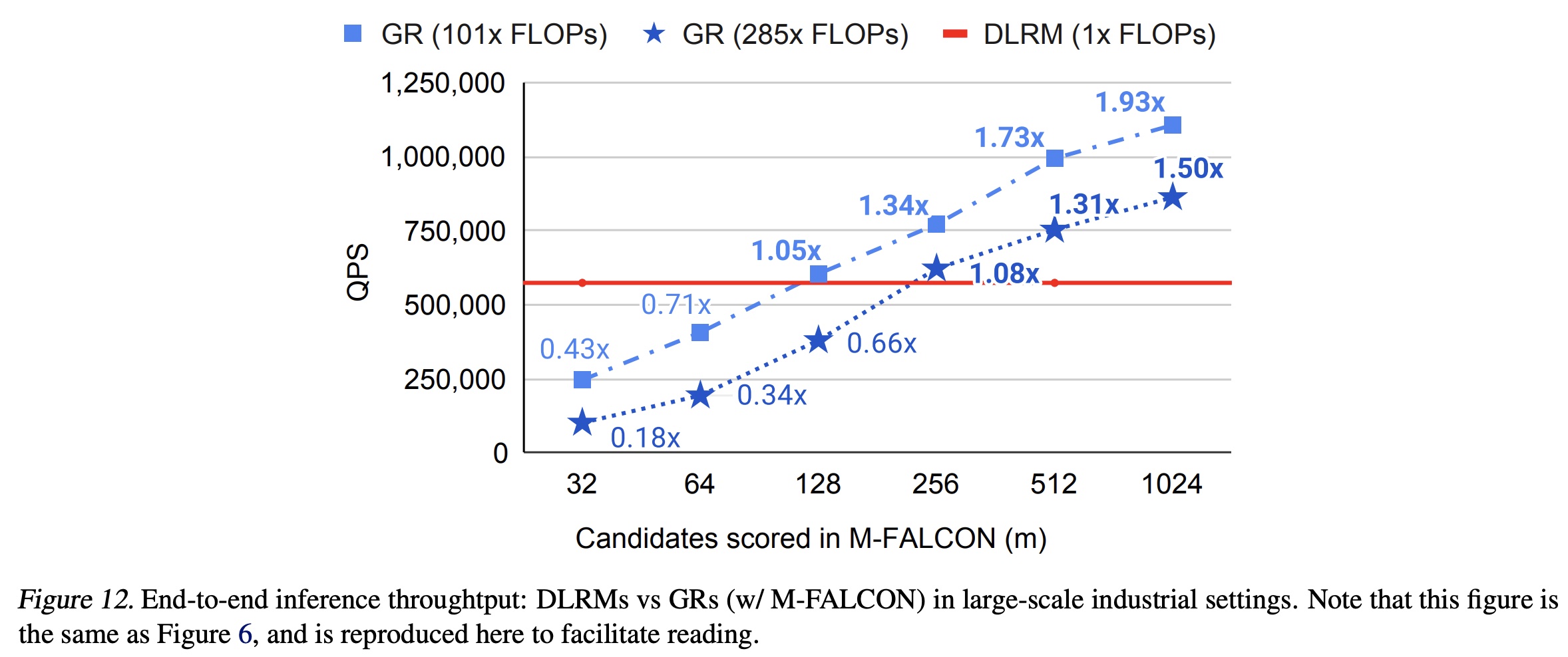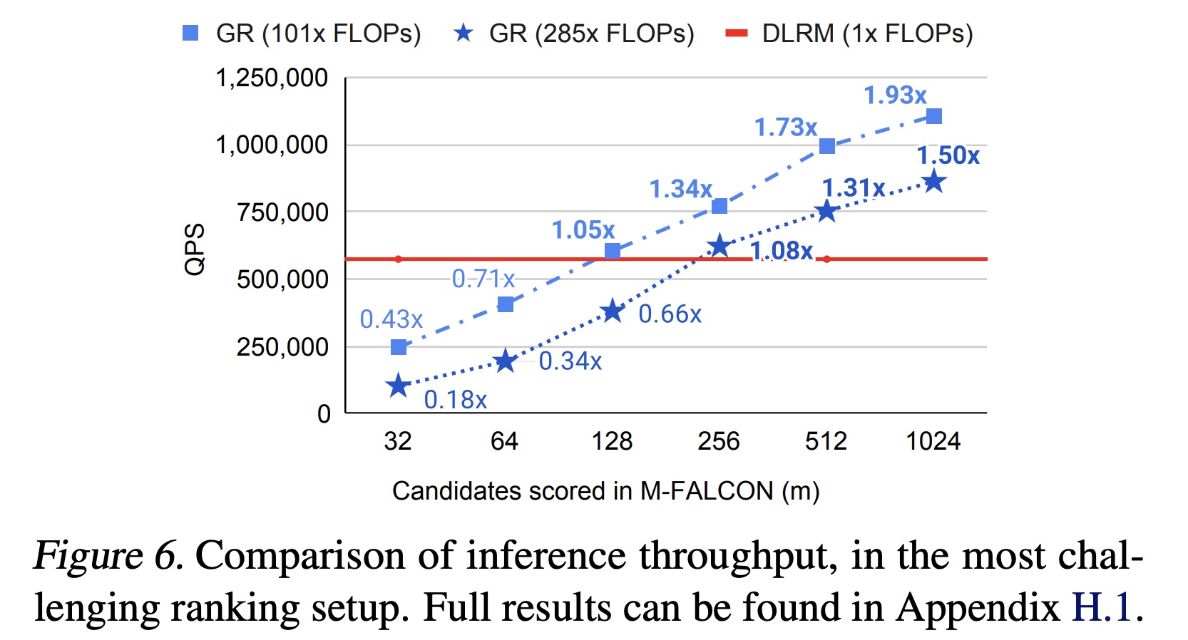如正文章节所述,M-FALCON 并行处理 candidates ,以在推理时将计算成本分摊到所有 candidates 上。为了理解我们的设计,我们比较了基于相同硬件配置的 GRs 和 DLRMs 的吞吐量(即每秒评分的 candidates 数量,QPS)。