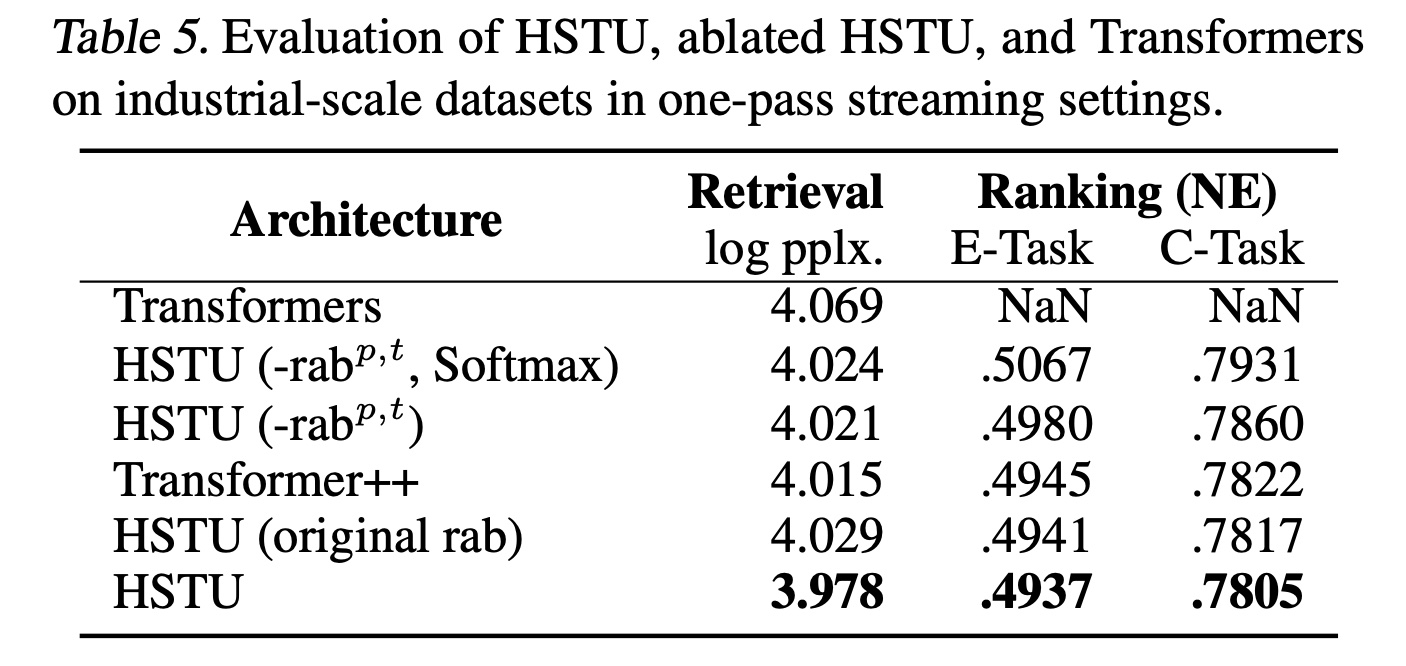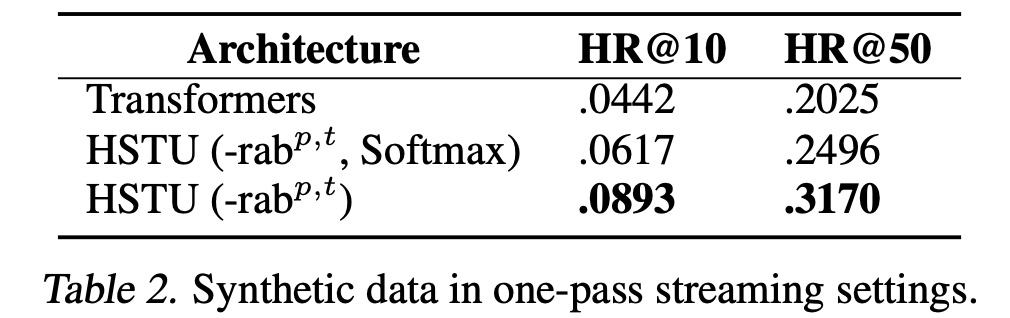 实验结果见 Table 2 。由于该数据集不包含时间戳,我们在 HSTU 中移除了 HSTU 的 Hit Rate@10 相比标准 Transformer 提升了 100% 以上。重要的是,将 HSTU 的 pointwise attention 机制替换为 softmax(即,“HSTU w/ Softmax”)也会导致 hit rate 显著下降,这验证了 pointwise attention-like 的聚合机制的重要性。