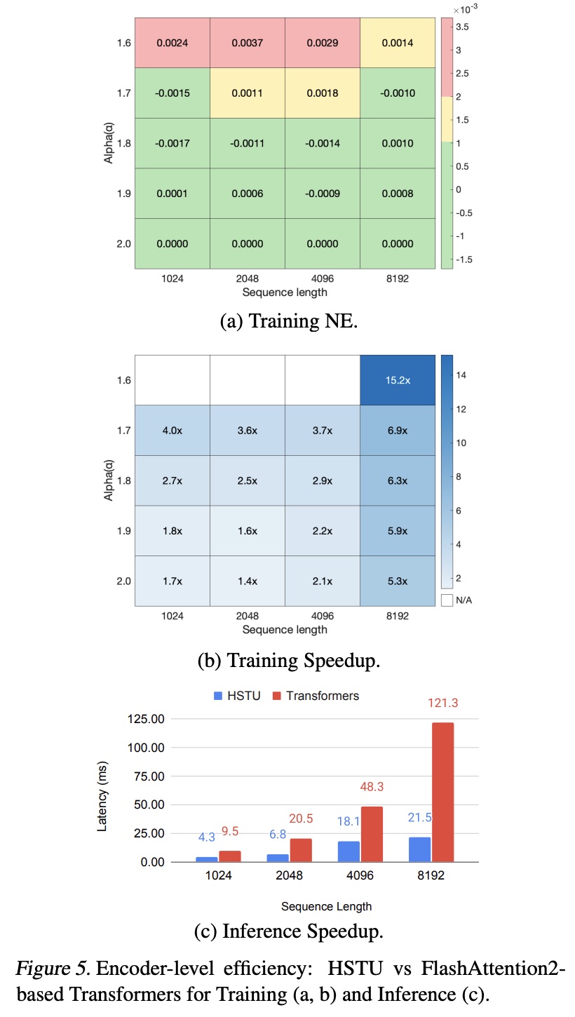 microbatches 本身就可以提高吞吐量。caching 进一步消除了 microbatching 之上的冗余的 linear and attention computations。如 Figure 13 所示,与使用单个 microbatch 的 1.99 倍的额外加速。总体而言,凭借高效的 HSTU encoder 设计并利用 M-FALCON,基于 HSTU 的 Generative Recommenders 在大规模 production setup 下的吞吐量方面比 DLRM 高达 2.99 倍,尽管 GR 在 FLOPs 方面复杂度要高出 285 倍。
