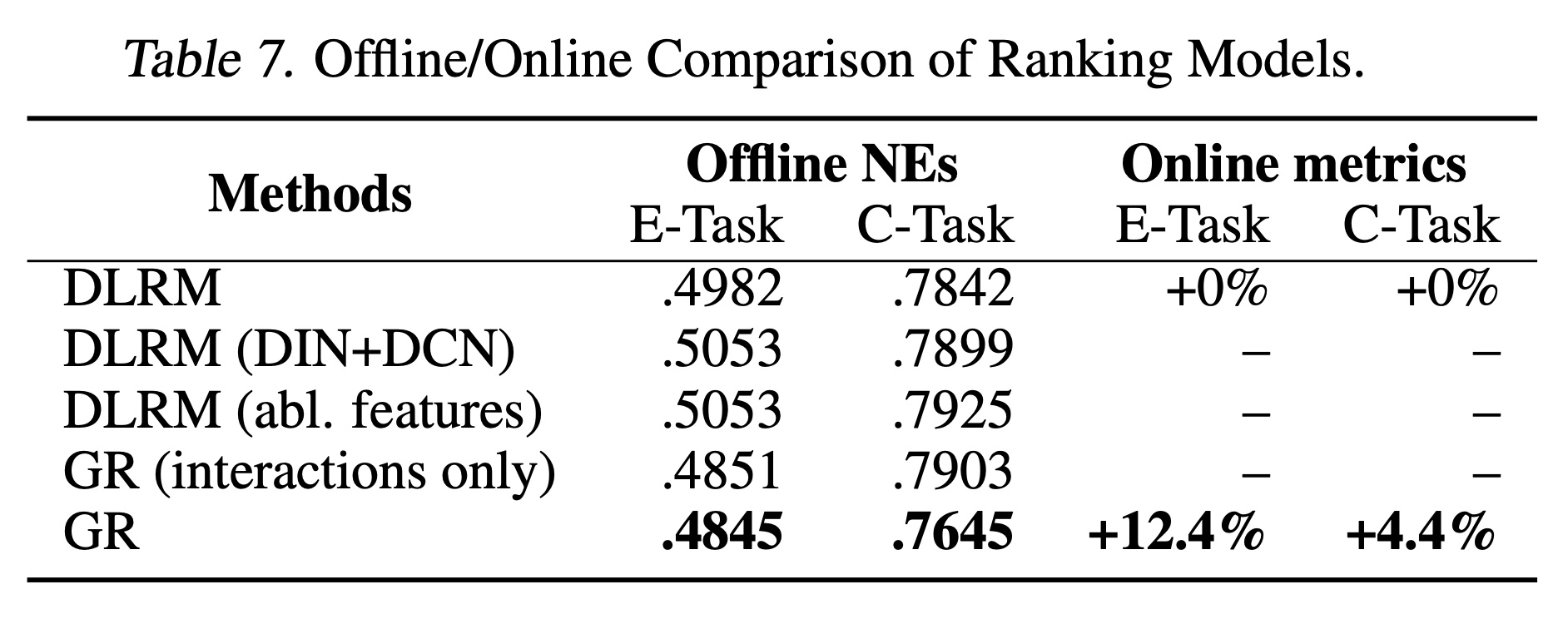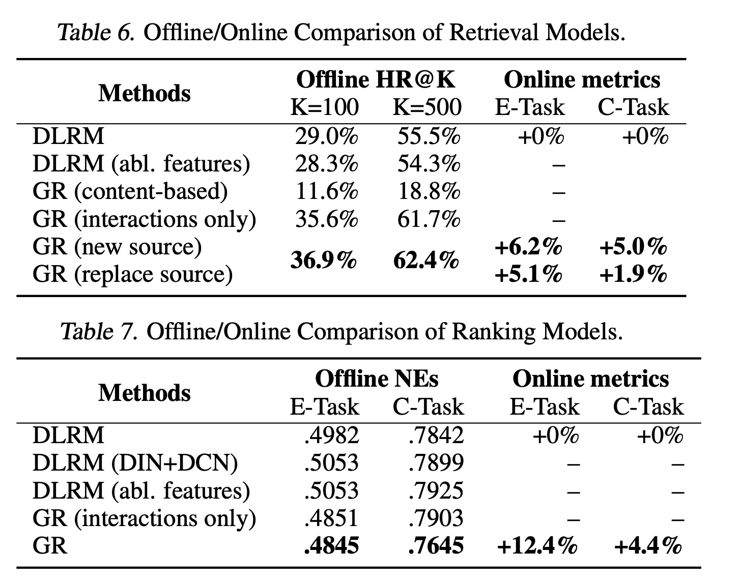 b):通过 target-aware formulation (Figure 2)利用 cross-attention interaction 来捕获 numerical features 。我们通过实验验证了这一点:忽略此类特征的传统 “interaction-only”公式导致模型质量显著下降。而在 Table 7 和 Table 6 中的 “GR (interactions only)” 我们发现,仅仅使用 interaction history 将导致retrieval 的 HR@100 下降 1.3% 、ranking 的 NE 下降 2.6% (0.1% 的 NE 变化即视为显著)。