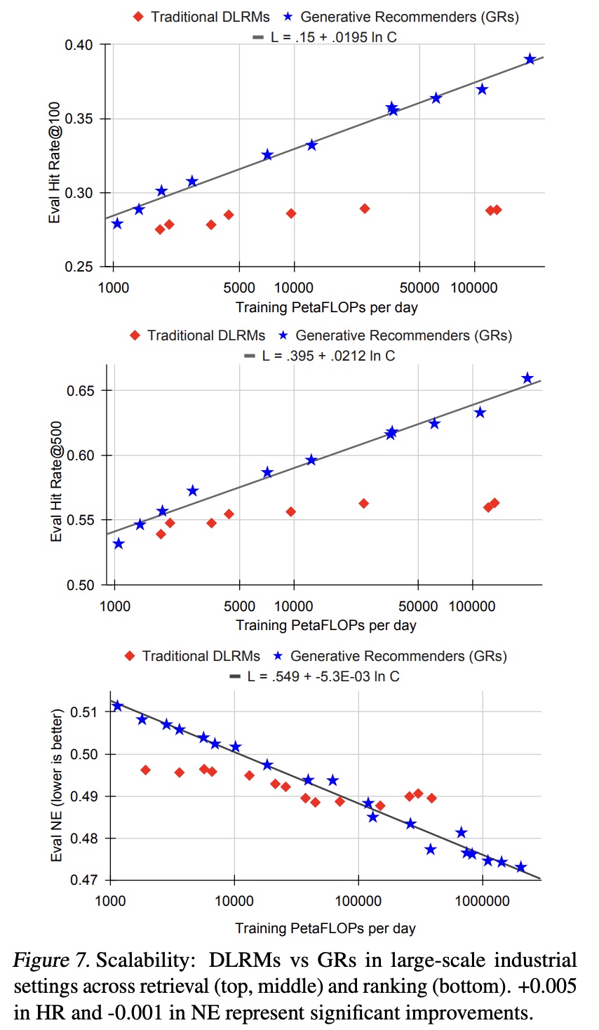 最终,我们的所有主要指标(包括 retrieval 的 HR@100 和 HR@500 ,以及 ranking 的 NE)在适当的超参数下,经验上均随计算量呈幂律(power law )缩放。我们在三个数量级范围内观察到这一现象,直至我们能够测试的最大模型( 8192 序列长度、1024 的 embedding 维度、24 层HSTU),此时我们使用的总计算量(归一化至 365 天,因为我们使用了标准 streaming training setting )接近 GPT-3 和 LLaMA2 的总训练计算量,如 Figure 1 所示。在合理范围内,与应用的总训练计算量相比,具体的模型超参数影响较小。与语言建模(《Scaling laws for neural language models》)不同,序列长度在 GRs 中起着更为关键的作用,因此同步 scale up 序列长度和其他参数至关重要。这可能是我们提出的方法最重要的优势,因为我们首次证明了来自 LLMs 的scaling law 也适用于大规模推荐系统。