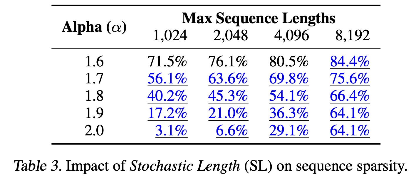 Table 3 展示了具有 30 天用户历史的典型工业规模的 configuration 下,不同序列长度和 F)。模型质量下降可忽略的 settings 用蓝色下划线突出显示。标记为 SL 的 base sparsity 的情况。较低的 8192。