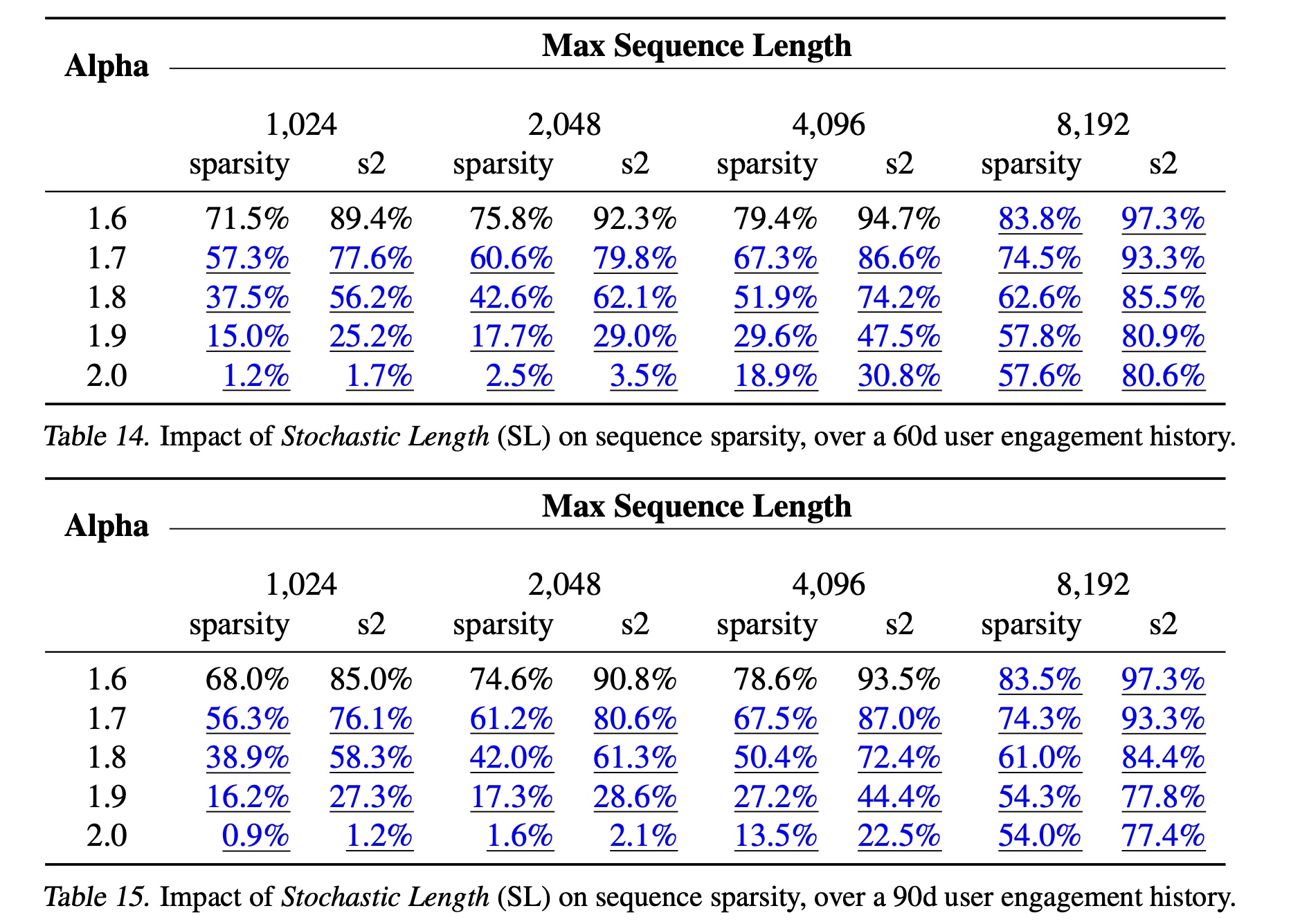 在 Table 3 中,我们展示了 Stochastic Length 对具有 30-day user engagement history 的典型工业规模配置的 sequence sparsity 的影响。sequence sparsity 定义为: