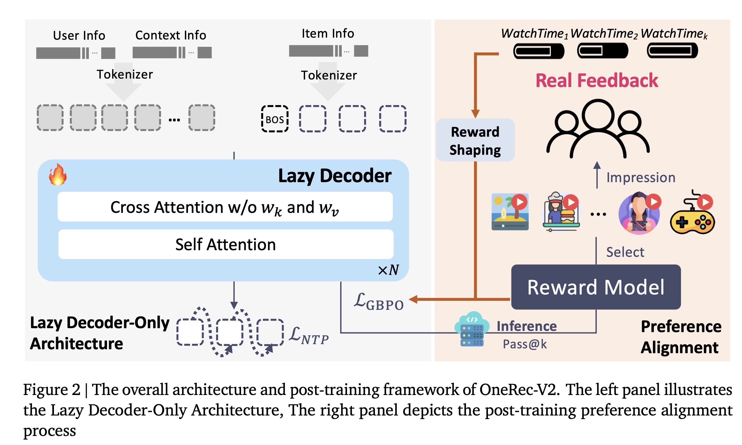 Reward Model:引入 reward-model-based reinforcement learning,与 OneRec-V1 的主要区别在于 pretrained generative model 的架构:OneRec-V1 使用 Encoder-Decoder 架构,而 OneRec-V2 采用提出的 Lazy Decoder 架构。