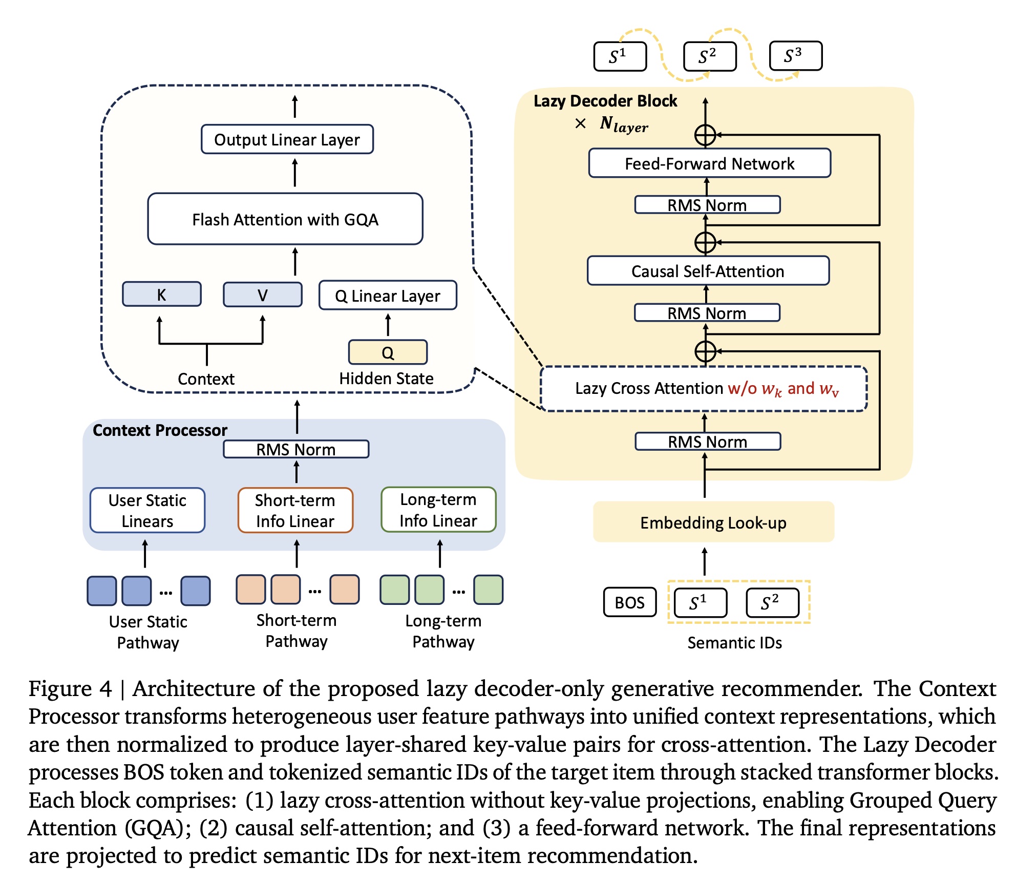 首先,我们提出了一种 lazy decoder-only 架构,既不同于传统的 encoder-decoder 模型,也不同于朴素的 decoder-only 方法。我们的 design 将 context 视为仅通过 cross-attention 访问的 static conditioning information ,在保留模型捕获复杂的 user-item interactions 的能力的同时,消除了冗余计算。
