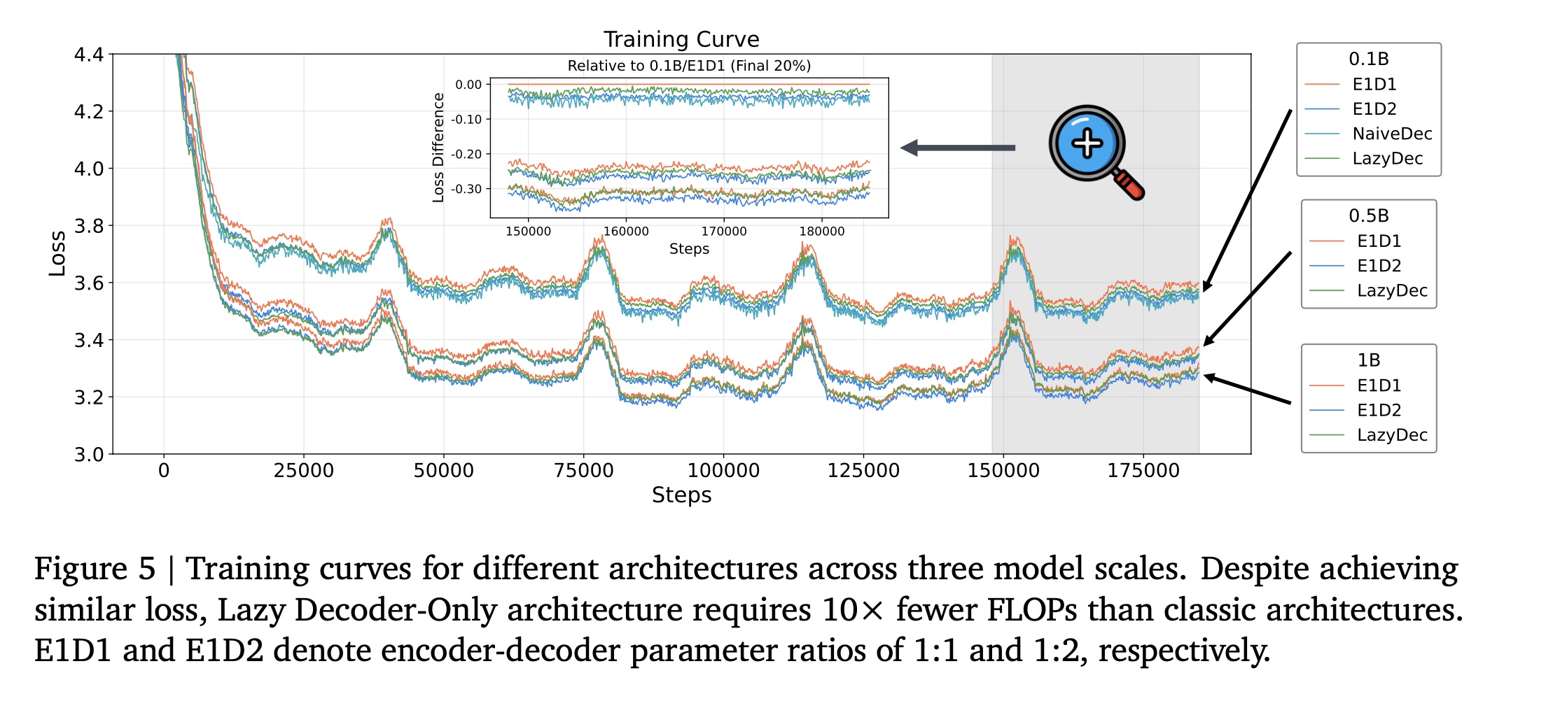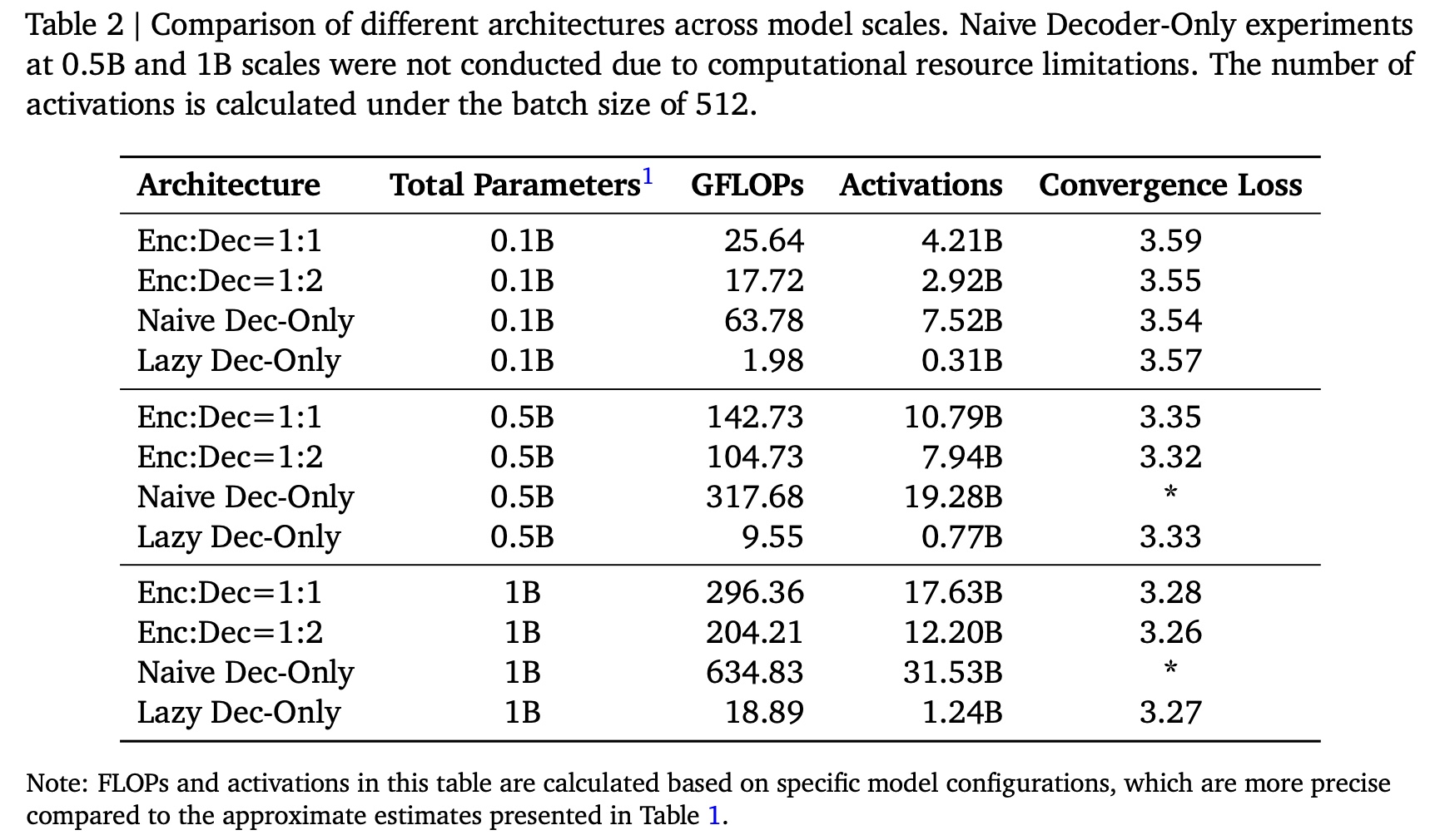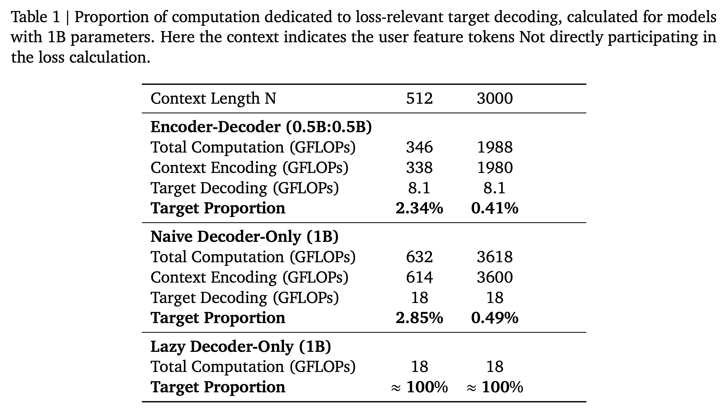 Encoder-Decoder Architecture:我们分析了 encoder 和 decoder 组件均为 0.5B 参数的 encoder-decoder 模型的计算需求。在 training with compressed context length 𝑁/5 的过程中,浮点运算量(FLOPs)分解如下: