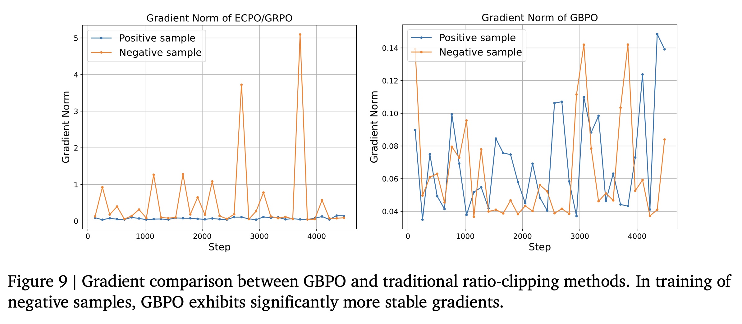 对于来自传统 pipeline 所生成的曝光样本,policy ratio 始终为 1。在传统的强化学习方法中,ratio 为 1 的样本被视为 stable 从而用于训练,不进行截断。然而,实际上,此类样本仍然可能导致梯度爆炸——这是由负样本引起的,如 Figure 9 所示。